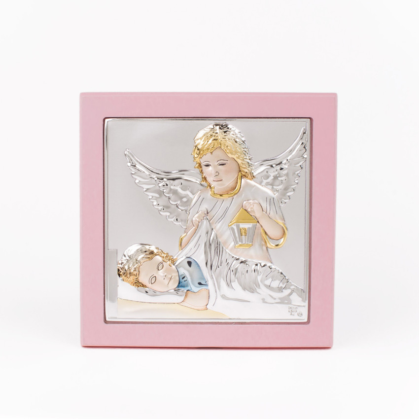 Детская Иконка Ангела Хранителя 11х11см в серебре, покрыта разноцветной эмалью, в розовом киоте
