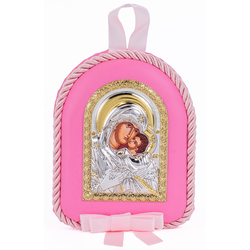 Детская Иконка на розовой подушечке Божья Матерь Умиление Сладкое Целование 8х10см в серебре