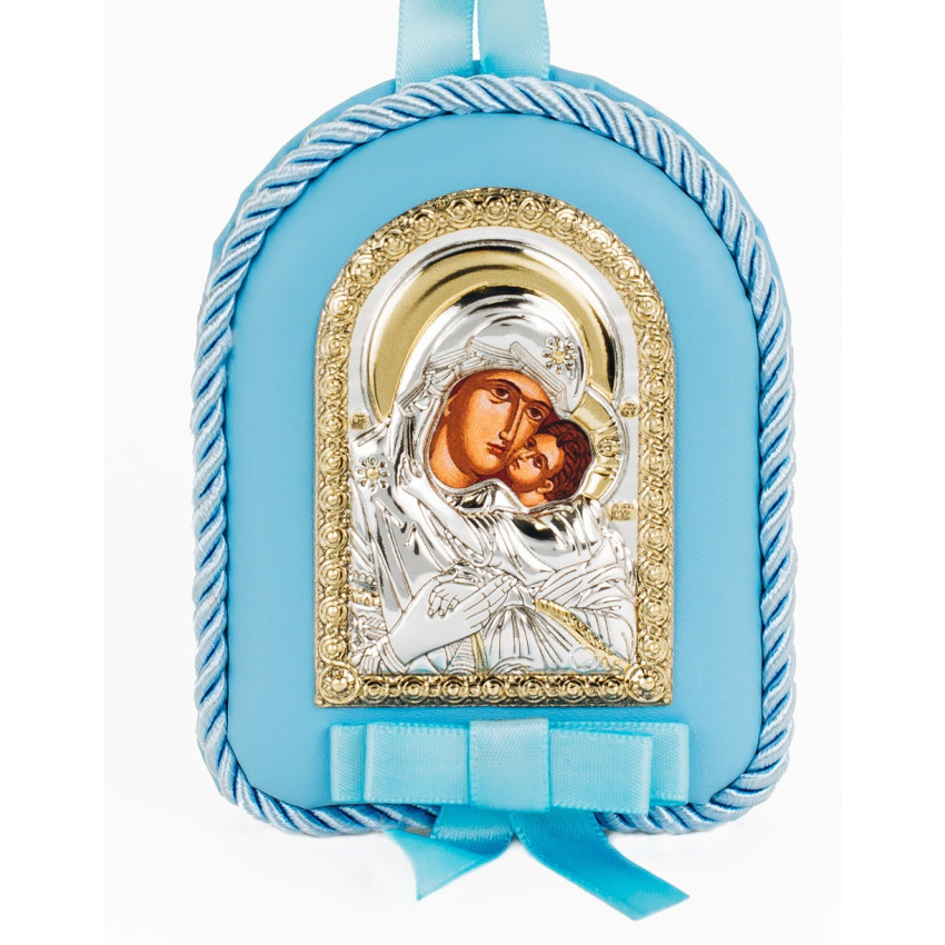 Детская Иконка на синей подушечке Божья Матерь Умиление Сладкое Целование 8х10см в серебре