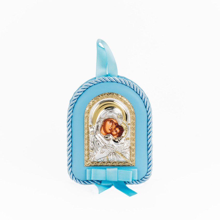 Серебряный оклад изготовлена из алюминиевого основания покрытого на лицевой части ламинированным слоем серебра 925, закреплен на мягкой синей подушечке синего цвета, которую удобно вешать в кроватку!