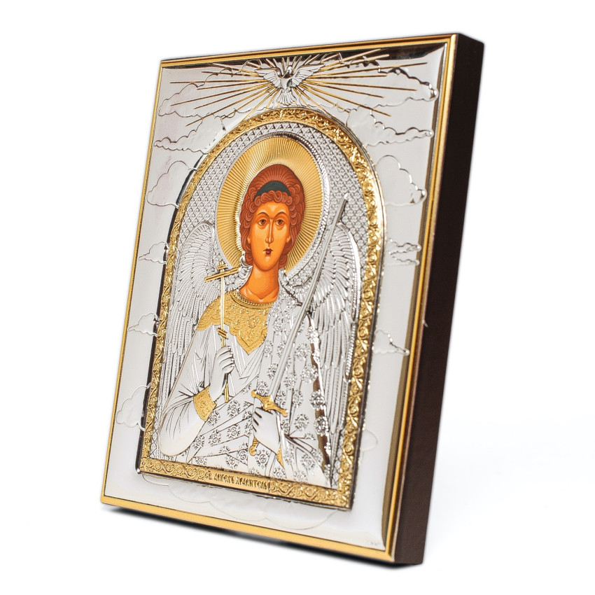 Оклад изделия изготовлен из комбинированного листа металла miro-silvero – верхняя часть которого ламинирована серебром 999°: в отдельных местах композиция удачно украшена сусальным золотом, что придает ей более контрастный вид. С помощью современных методов обработки драгоценных металлов и инновационного оборудования производителю удалось достичь наивысшего качества детализированного изображения на серебре – все элементы орнамента композиции иконы четко вырезаны и ярко просматриваются до мелочей. Лицо Святых – открытое и прописанное методом шелкографии на льняном полотне натуральными красками темпера. Внешний слой драгоценного металла иконы покрыт специальным защитным лаком, предохраняющим серебро от потемнения и старения, защищая его от внешних раздражителей таких как пыль и солнечные лучи – образ будет сохранять свой первозданный вид много лет.