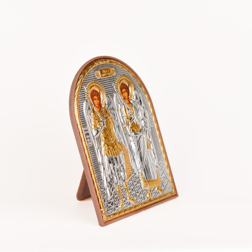 Оклад изделия изготовлен из комбинированного многослойного листа металла miro-silvero – верхняя часть которого ламинирована серебром 999° и в некоторых местах украшена сусальным золотом. Лицо Святых – открытое, прописанное методом шелкографии на льняном полотне натуральными красками «темпера». Внешний слой драгоценного металла иконы покрыт специальным защитным лаком, предохраняющим серебро от потемнения и старения, защищая его от внешних раздражителей таких как пыль и солнечные лучи – образ будет сохранять свой первозданный вид много лет.