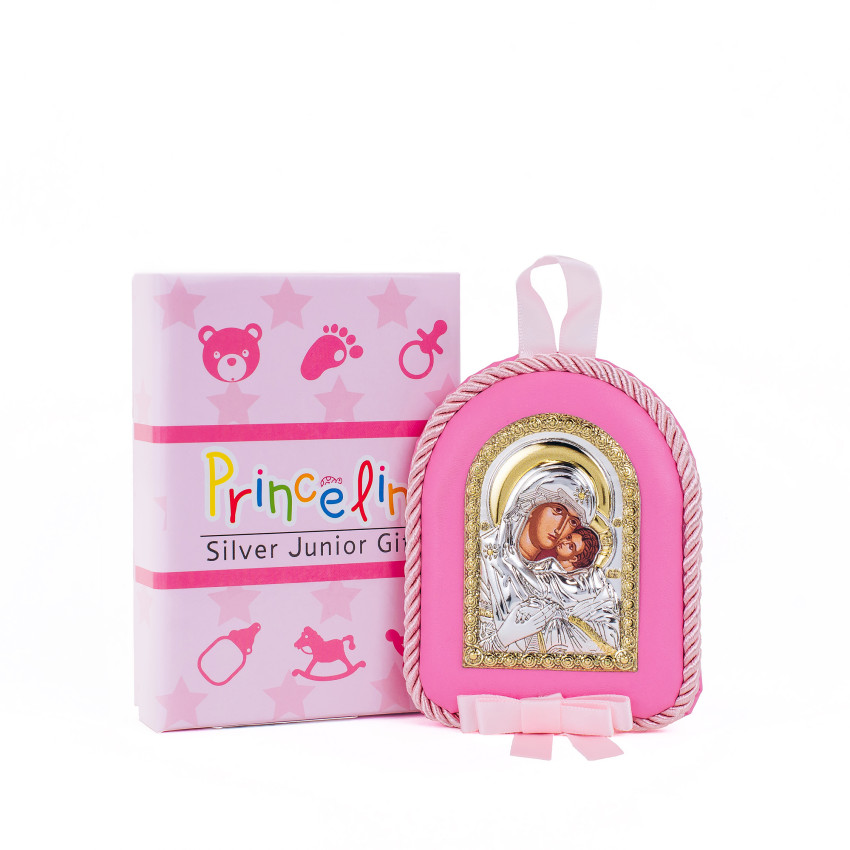 Серебряный оклад изготовлена из алюминиевого основания покрытого на лицевой части ламинированным слоем серебра 925, закреплен на мягкой розовой подушечке розового цвета, которую удобно вешать в кроватку!