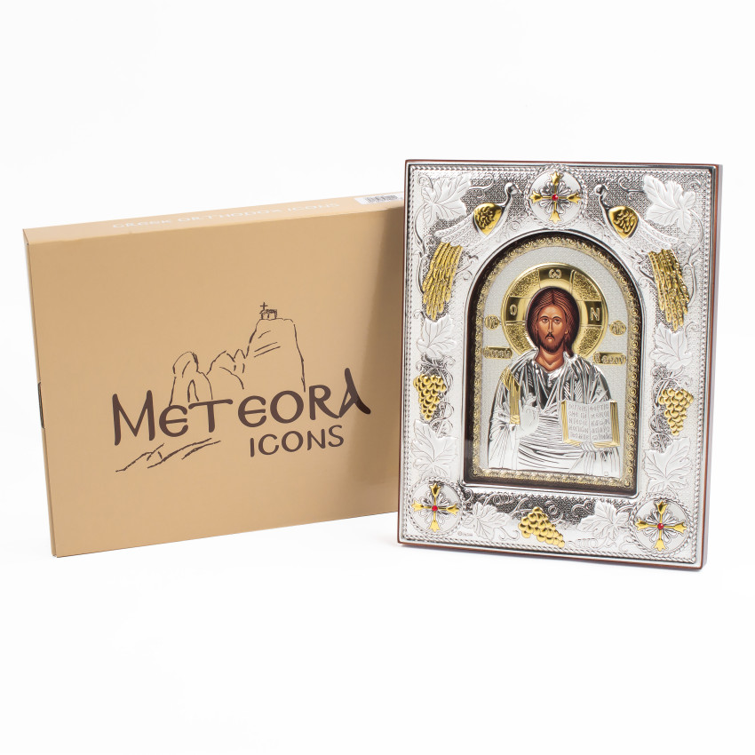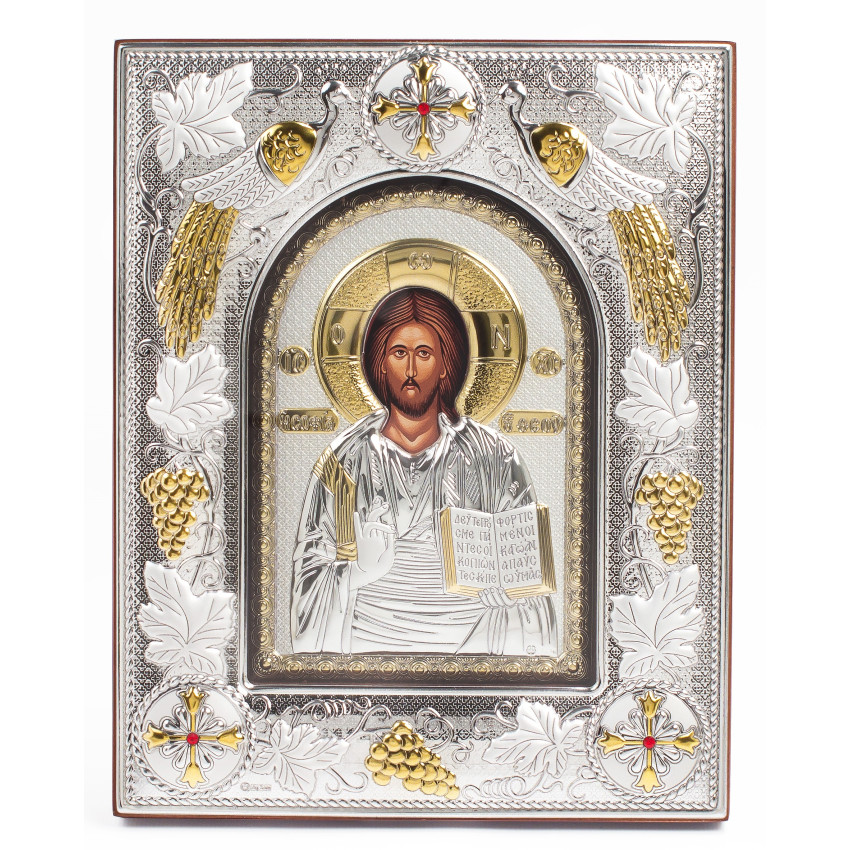 Икона Иисуса Христа 14x18x3см в серебряной прямоугольной рамке с позолотой под стеклом
