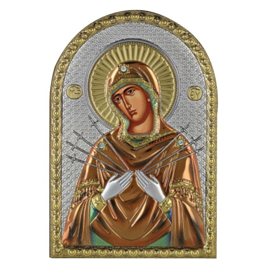 Представленная Иконы "Семистрельная Божья Матерь" сделана из серебряного оклада 925 пробы и позолоты , лик прописанный натуральными красками "темпера" методом шелкографии на натуральному холсте. Икона закрыта стеклом з серебряной рамкой украшеной орнаментом в виде цветов. Ссади икона покрыта тонкой кожой , есть откидная ножка. Сделана икона по всем православным канонам в старом византийском стиле, на лучшей иконописной фабрике Silver Axion (Греция)
