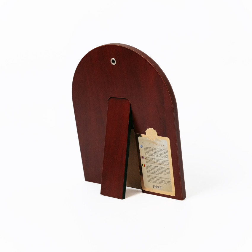 Закреплен оклад в деревянной основе (киоте) арочной формы, изготовленной из МДФ покрытого шпоном дерева. Сзади икона есть откидная ножка и отверстие для крепления на стене.