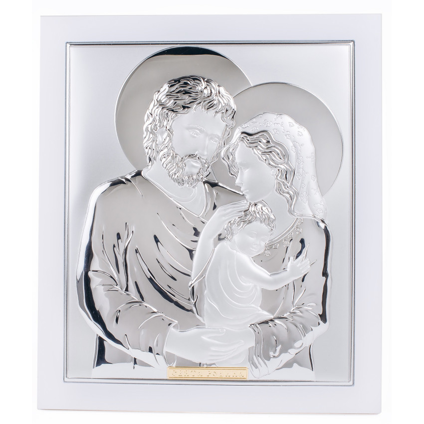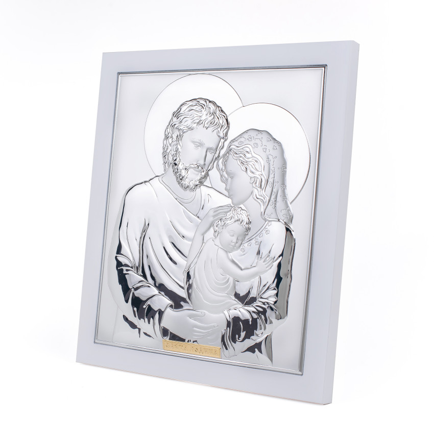 Икона Святое Семейство 19,5х21,9см серебряная прямоугольной формы на белом дереве с рамкой EP714-412XB-WH/S