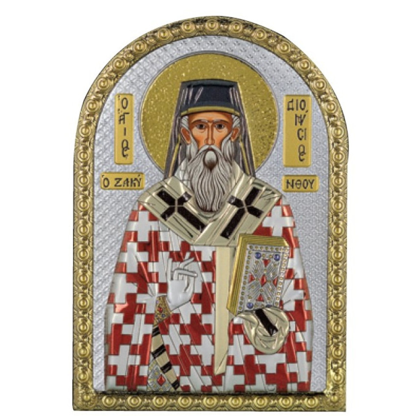 Икона Святой Дионисий 5х7см серебряная на пластику украшена разноцветной эмалью
