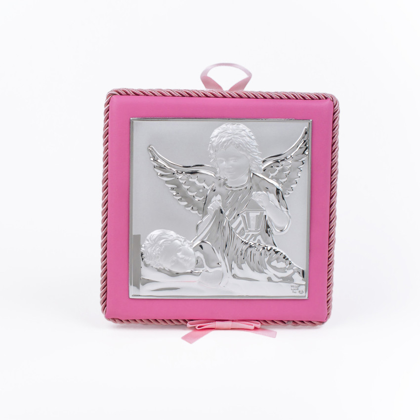 Серебряная икона "Ангел Хранитель" на мягкой розовой подушечке