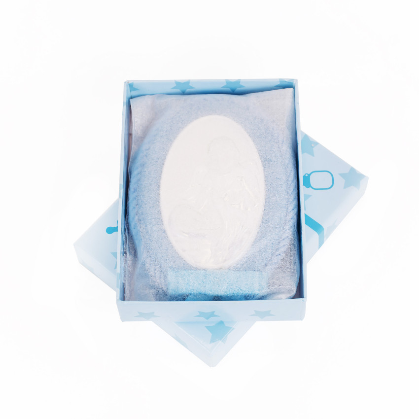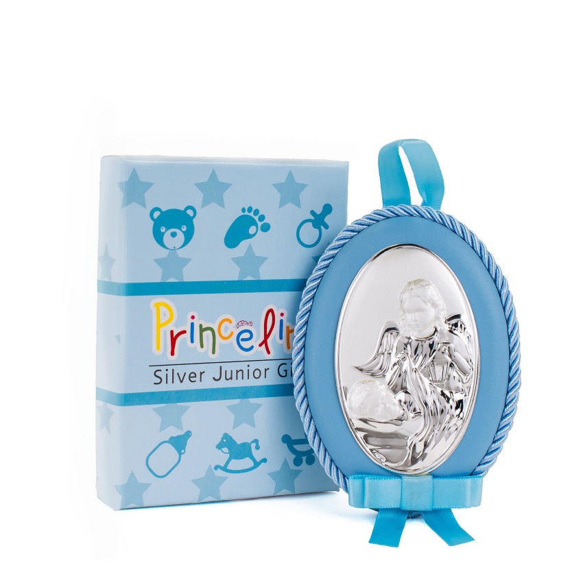 Серебряный оклад изготовлена из алюминиевого основания покрытого на лицевой части ламинированным слоем серебра 925, закреплен на мягкой синей подушечке синего цвета, которую удобно вешать в кроватку!