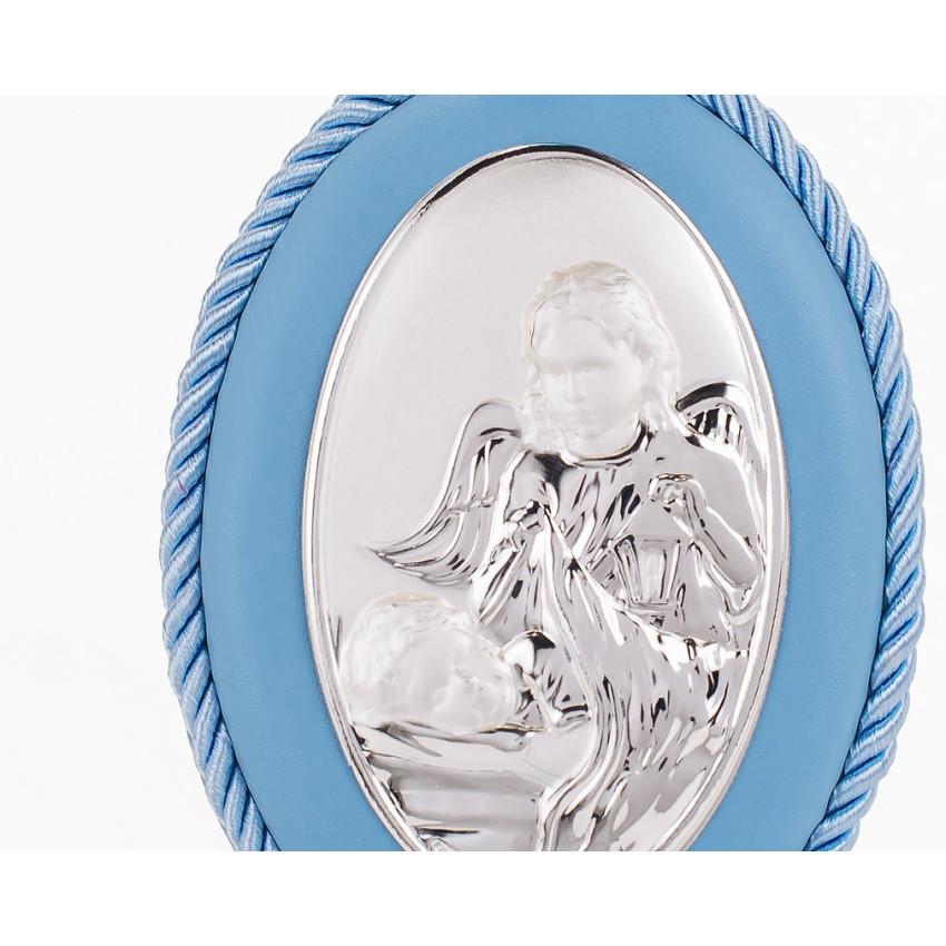 Серебряная детская иконка Ангел Хранитель 8х11 см на синей подушечке для мальчика