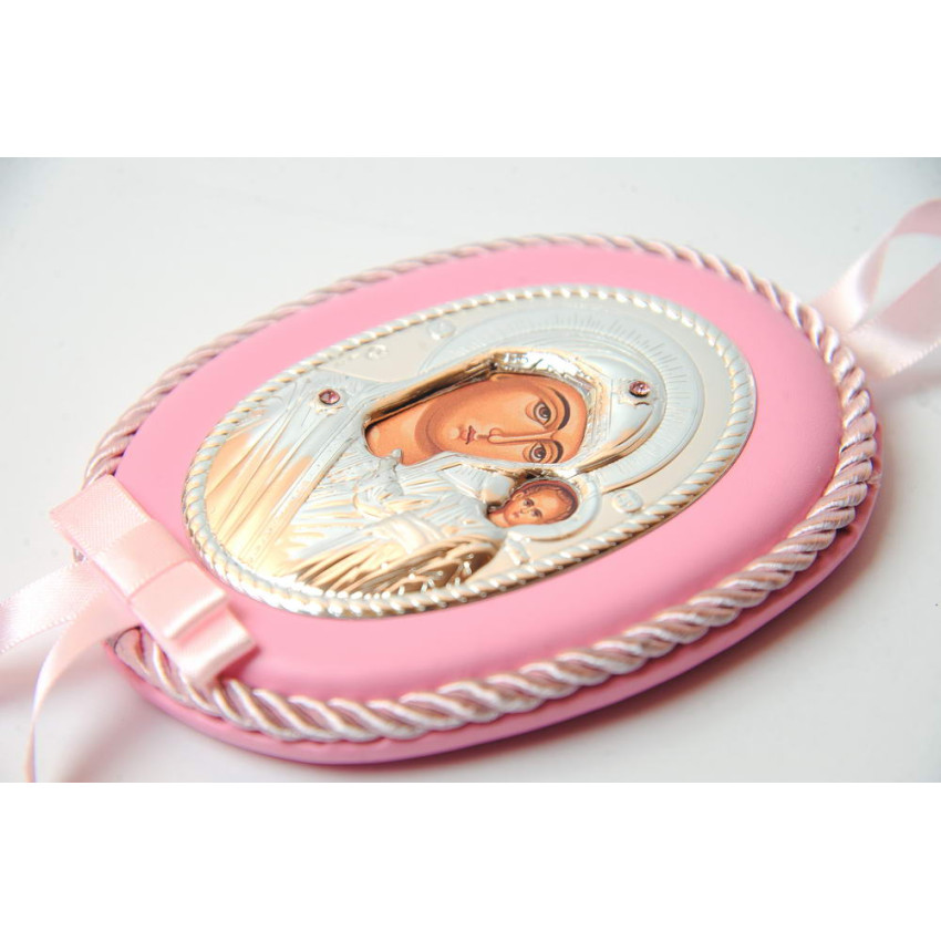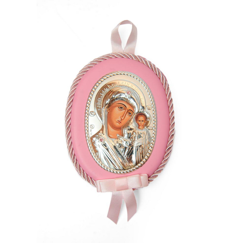 Серебряная детская иконка Казанская Божья Матерь 10х12,5см на розовой подушечке для девочки
