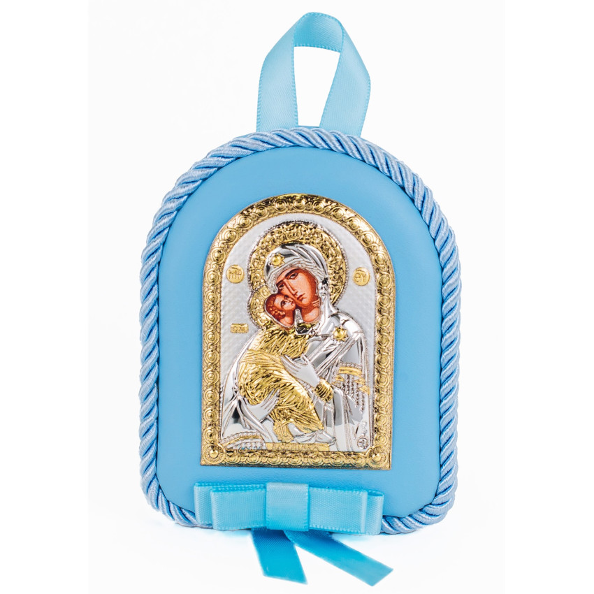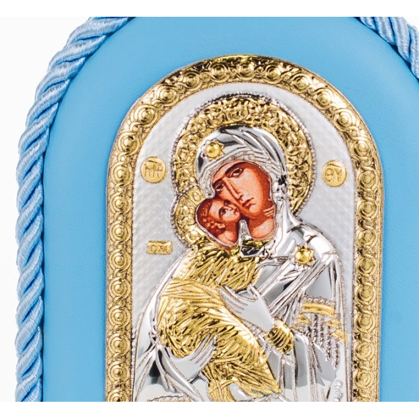 Серебряная детская иконка Владимирская Божья Матерь 8х10см на синей подушечке