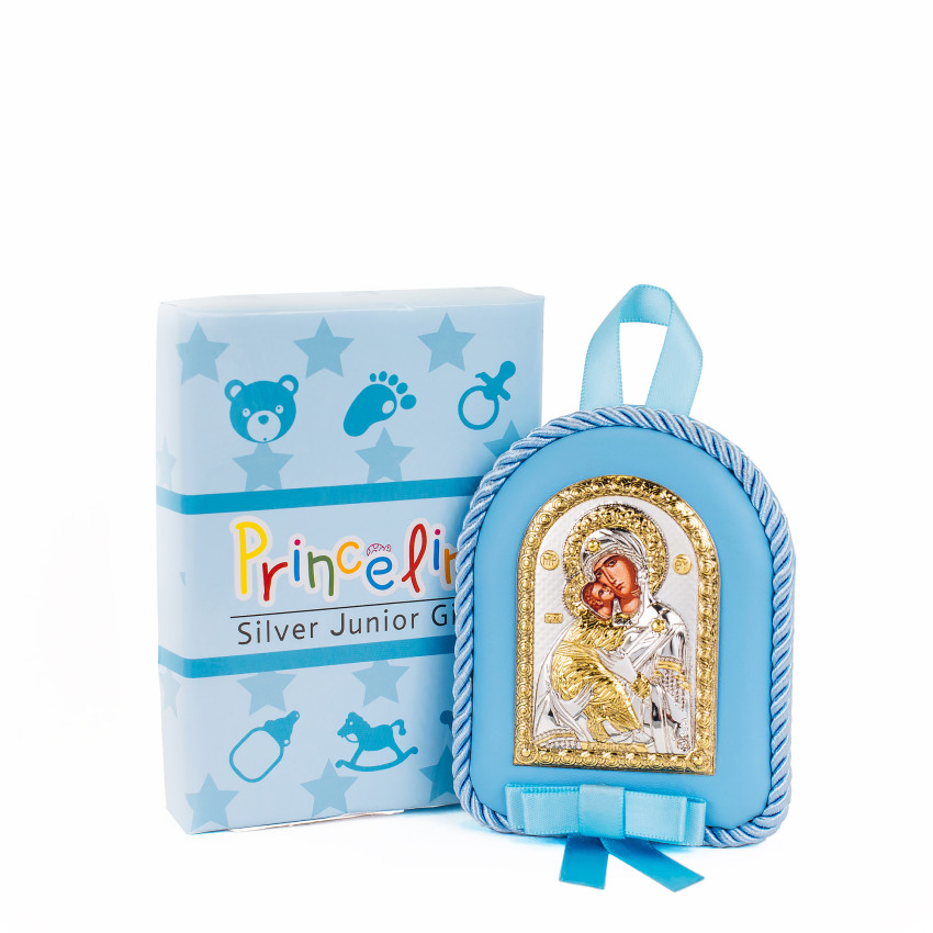 Серебряный оклад изготовлена из алюминиевого основания покрытого на лицевой части ламинированным слоем серебра 925, закреплен на мягкой синей подушечке синего цвета, которую удобно вешать в кроватку!