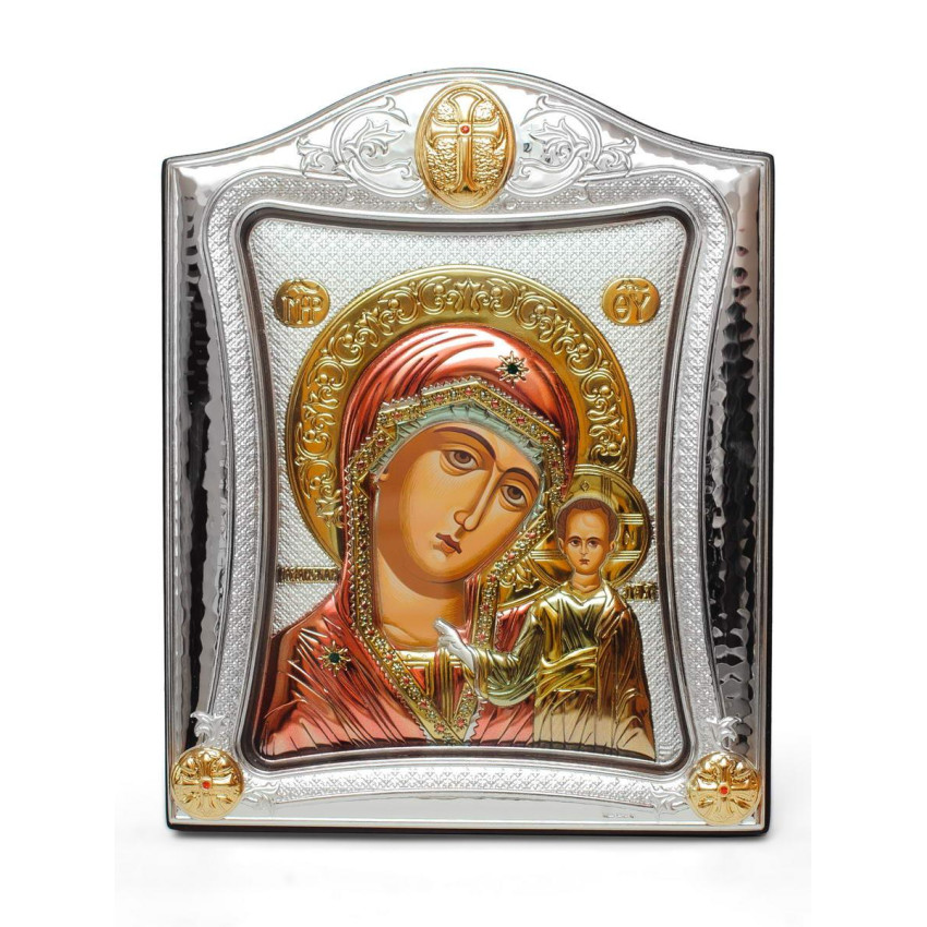 Икона Казанская Божья Матерь обрамлена в рамку из серебра инкрустированой тремя золотыми крестами; лик прописанный натуральными красками "темпера" методом шелкографии. Оклад сделан из алюминиевого основания покрытого на лицевой части ламинированным слоем серебра 925 пробы и позолотой, а так же украшена разноцветной ювелирной эмалью которая придает иконе большего блеска. С обратной стороны икона имеет отверстие для того, что бы вешать на стену и откидную ножку, в самых малых размерах ножка вставная. На иконе имеется сертификат и фирменная печать производителя. Икона надежно упакована в оригинальную фирменную коробочку и мешочек.