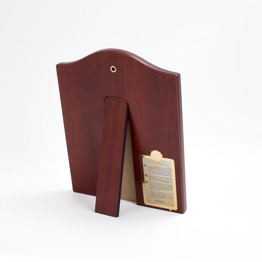 Закреплен оклад на деревянном киоте (основе) прямоугольной формы, изготовленной из МДФ покрытого шпоном дерева. Сзади икона есть откидная ножка и отверстие для крепления на стене.