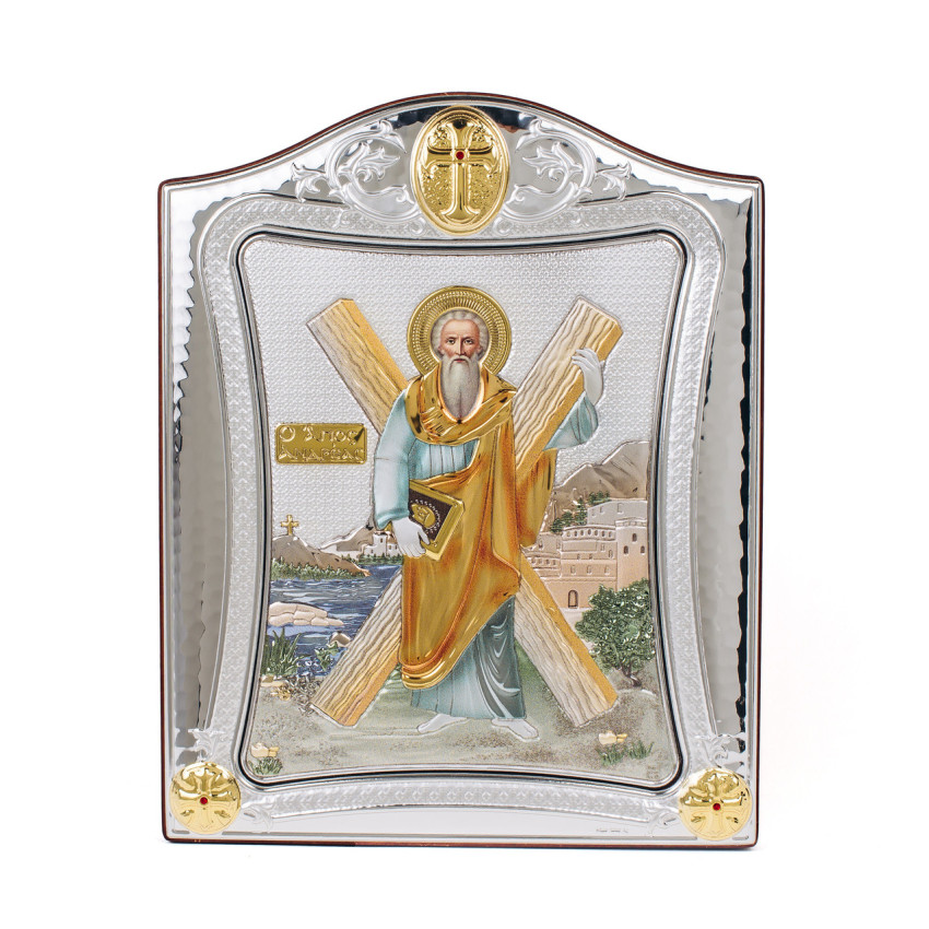 Икона Святого Андрея первозванного обрамлена в рамку из серебра инкрустированой тремя золотыми крестами; лик прописанный натуральными красками "темпера" методом шелкографии. Оклад сделан из алюминиевого основания покрытого на лицевой части ламинированным слоем серебра 925 пробы и позолотой и эмалью. С обратной стороны икона имеет отверстие для того, что бы вешать на стену и откидную ножку, в самых малых размерах ножка вставная. На иконе имеется сертификат и фирменная печать производителя. Икона надежно упакована в оригинальную фирменную коробочку и мешочек.