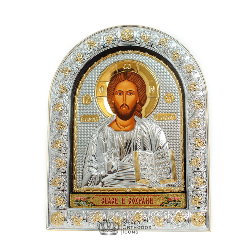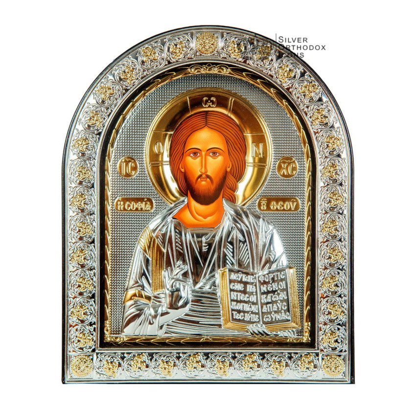 Предлагаемая Иконы "Спаситель Иисус" сделана из серебряного оклада 925 пробы и позолоты , лик прописанный натуральными красками "темпера" методом шелкографии на натуральному холсте. Икона закрыта стеклом з серебряной рамкой украшеной орнаментом в виде цветов. Ссади икона покрыта тонкой кожой , есть откидная ножка. Сделана икона по всем православным канонам в старом византийском стиле, на лучшей иконописной фабрике Silver Axion (Греция)