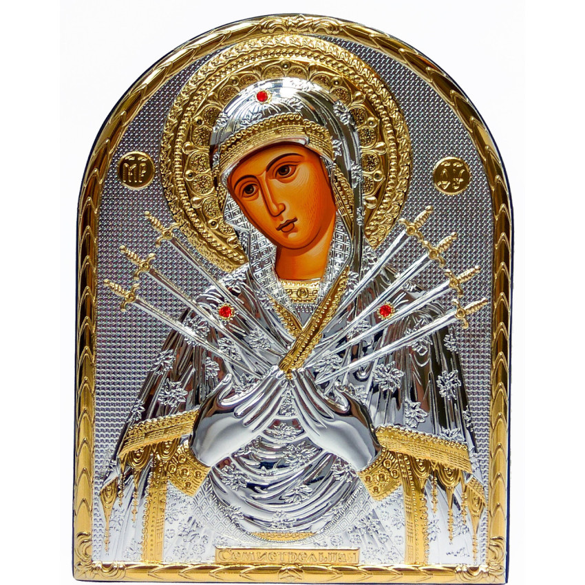 Икона арочной формы в коже "Семистрельная Божья Матерь"