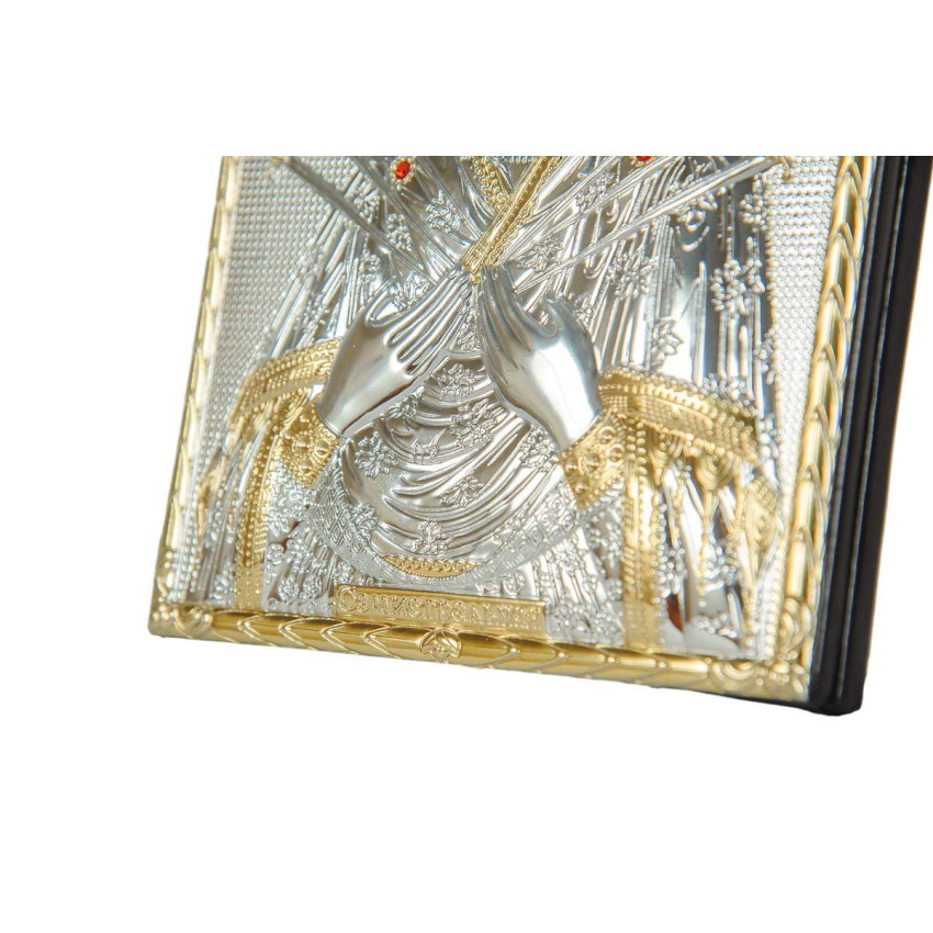 Оклад образу виготовлений із листа Miro-Silvero (італійського виробництва); нижня основа матеріалу - алюмінієвий віддзеркалюваний метал ALADO який зверху ламінований сріблом 999 проби тонким шаром. Срібло покрите захисним оксидним лаком, який зберігає матеріал від потемніння та зовнішніх подразників. Окремі частини ікони прикрашені сусальним золотом. Всі елементи сюжету ікони до найменших деталей та узорів чітко вирізьблені на окладі, які разом створюють гармонійну яскраву картину.Закріплений оклад в дерев'яній основі (кіоті) аркової форми, яка виготовлена із МДФ покритого шпоном дерева. Ззаду ікони є відкидна ніжна та отвір для кріплення на стіні.Колір дерева: коричневий (горіхова текстура).Лик ікони прописаний на полотні натуральними фарбами "Темпера" за допомогою метода шовкографії.Образ упакований в оригінальну картонну коробочку від виробника з логотипом компанії, яка має чудовий подарунковий вигляд.Ззаду на іконі є закріплений Сертифікат якості, який засвідчує оригінальність виробу.Виробник: Prince Silver Греція. ..