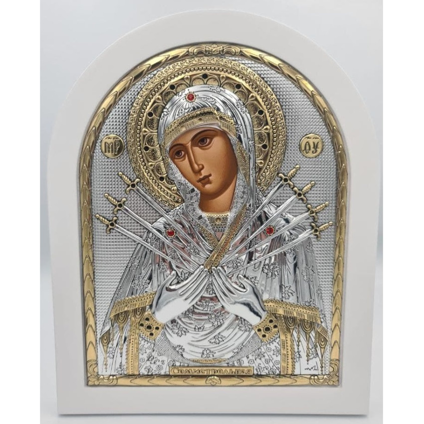 Семистрільна Ікона Божої Матері 20х25см аркової форми на білому дереві EP5-152XAG-WH/P