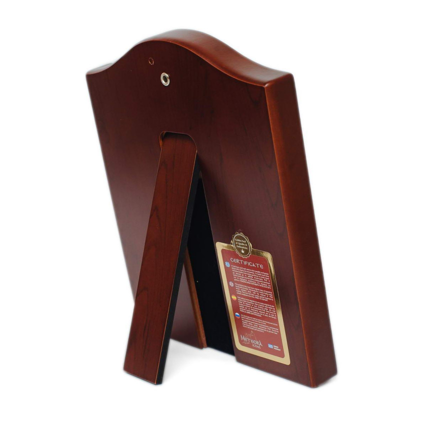 Сзади иконы есть откидная ножка-подставка и отверстие что бы вешать икону на стену. Надежно упакована в оригинальную фирменную коробочку и мешочек, на иконе есть сертификат качества от производителя, подтверждающий что это не подделка.
