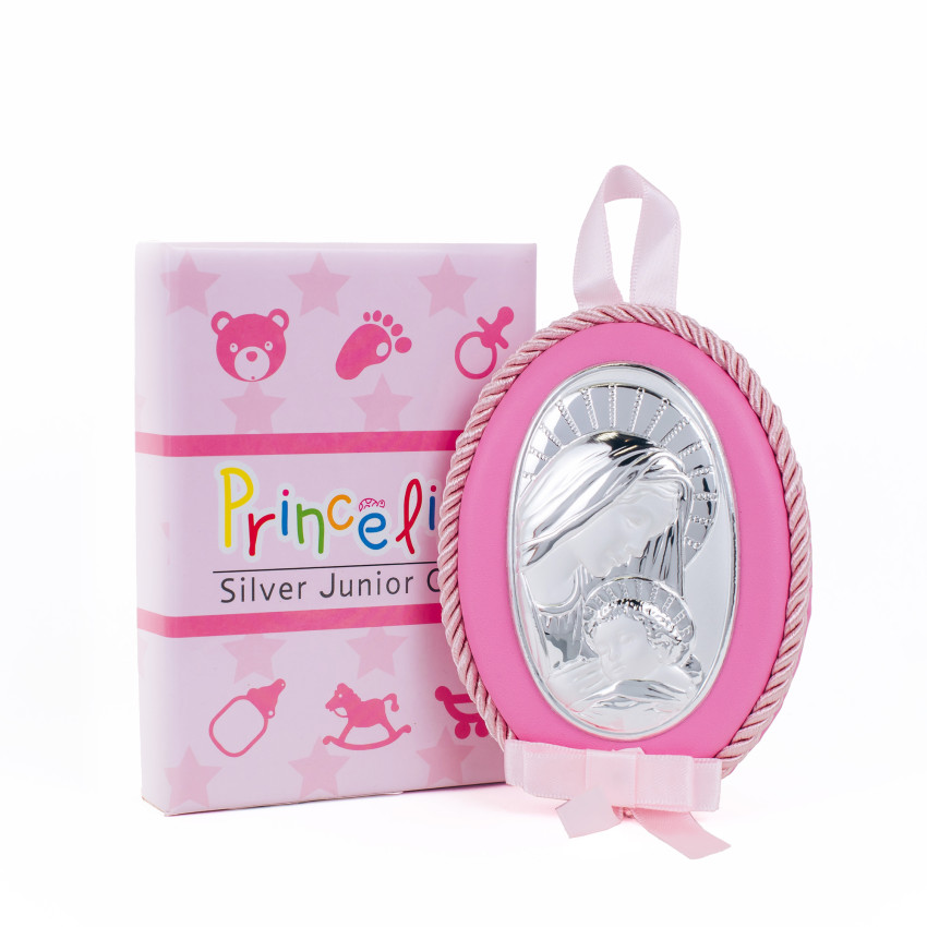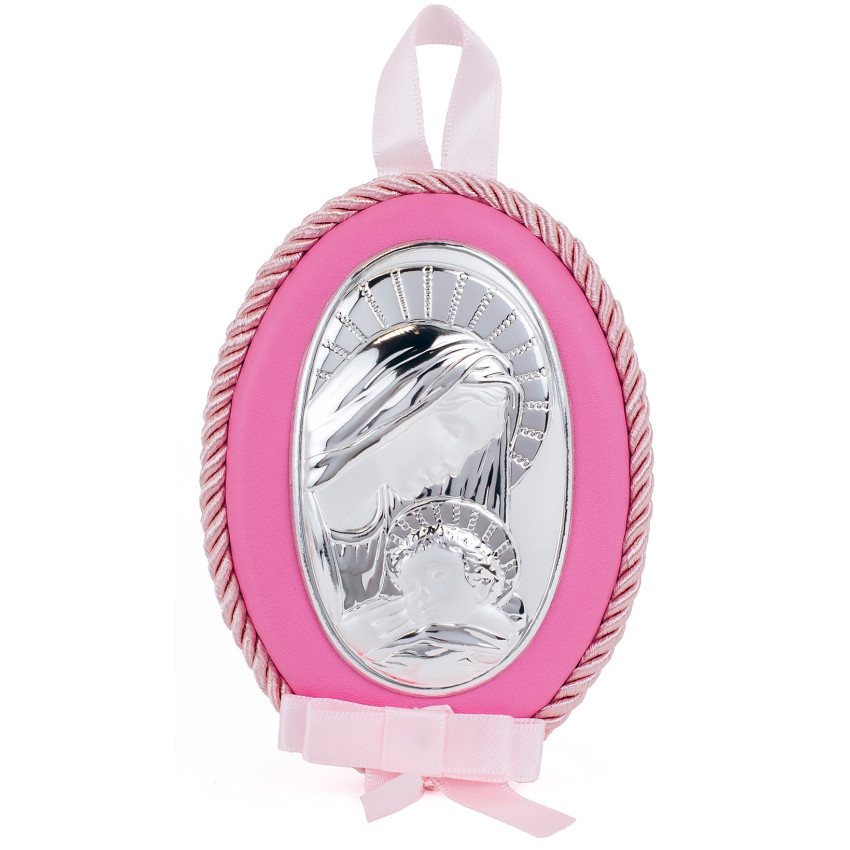 Срібна дитяча іконка Мадонна з Немовлям 8х11см на рожевій подушечці для дівчинки