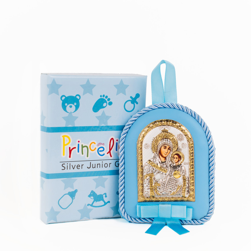 Срібна дитяча іконка Єрусалимська Божа Матір 8х10см на синій подушечці