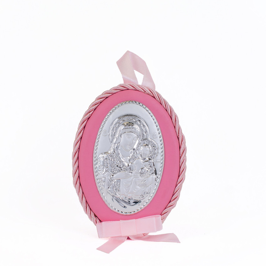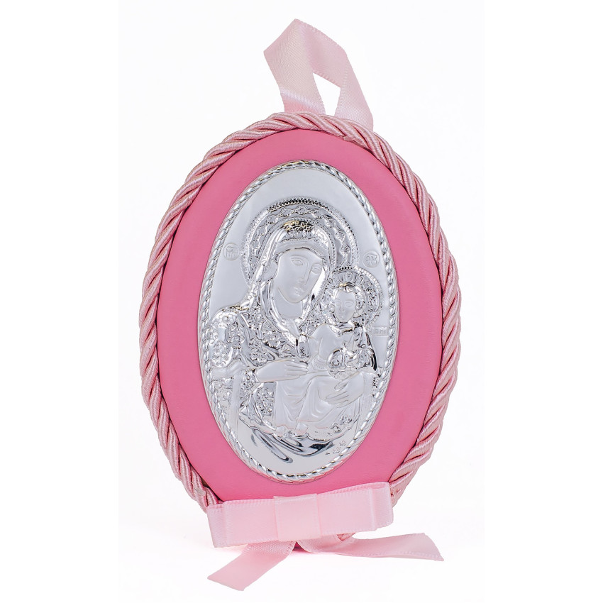 Срібна дитяча іконка Єрусалимська Божа Матір 8х11см на рожевій подушечці для дівчинки