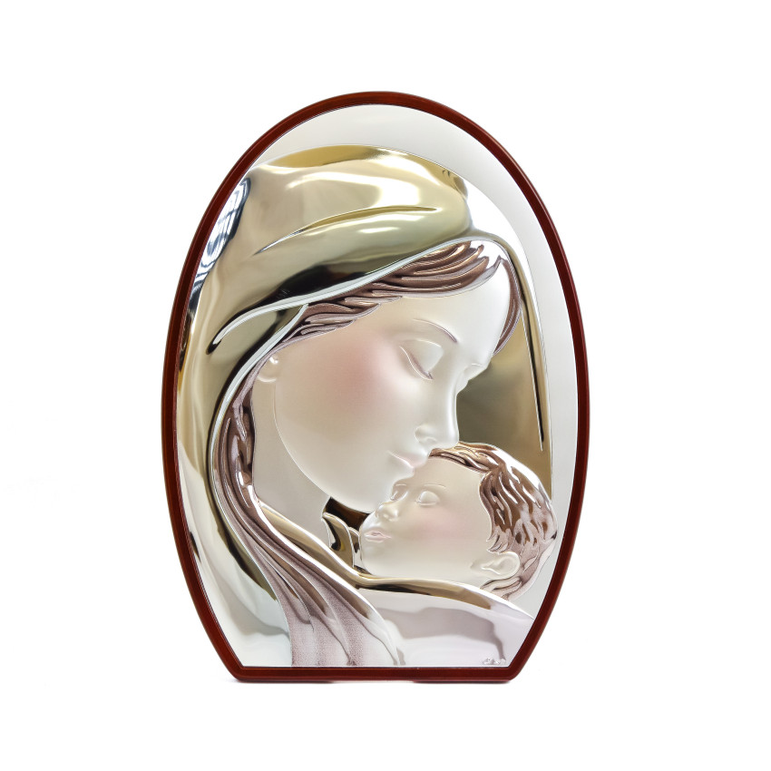 Срібна ікона "Марія з Ісусом" прикрашена різнобарвною ювелірною емалью 21х15см