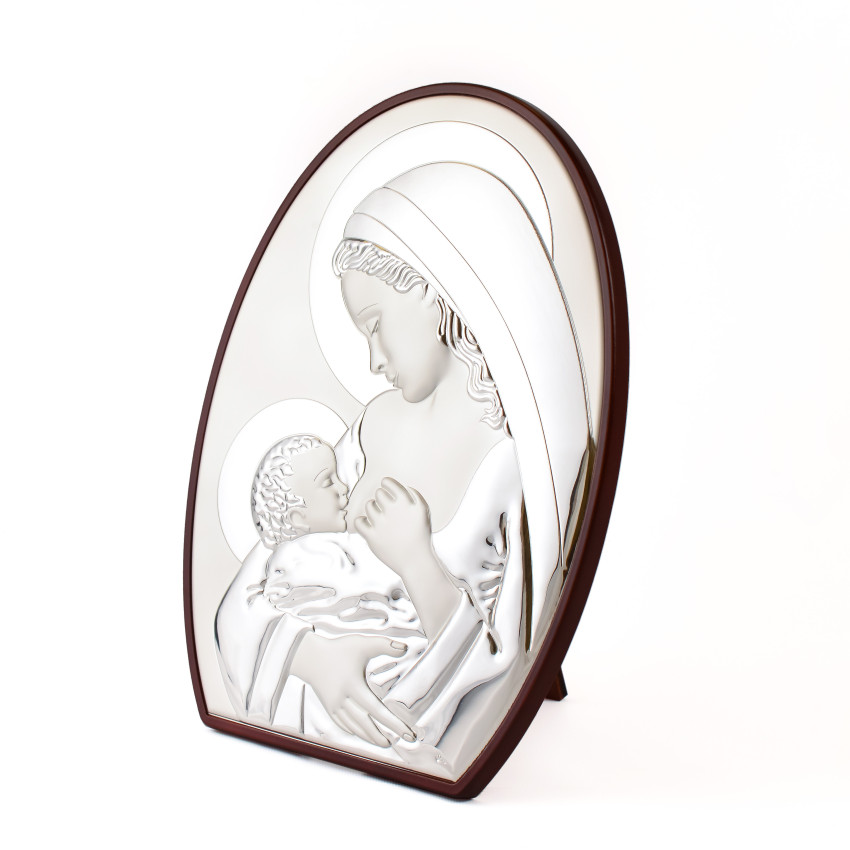 Образ має класичну аркову форму з дерев'яною рамкою.Основна частина ікони зображена на полотні - вона прописане методом шовкографії на лляному полотні натуральними фарбами «темпера» і обрамлена в срібну рамку, яка виготовлена із комбінованого листа металу miro-silvero – верхня частина якого ламінована сріблом 999°: в окремих місцях композиція вдало прикрашена сусальним золотом що придає їй більш контрастного вигляду. За допомогою сучасних методів обробки дорогоцінних металів та новаційного устаткування, виробнику вдалося досягнути найвищої якості деталізованого зображення на сріблі - всі елементи орнаменту композиції ікони чітко вирізьблені та яскраво проглядаються до найменших дрібниць. Зовнішній шар дорогоцінного металу ікони покритий спеціальним захисним лаком, що уберігає срібло від потемніння та старіння, захищаючи його від зовнішніх подразників таких як пил та сонячні промені – образ зберігатиме свій первозданний вигляд багато років.Закріплений оклад на дерев'яній основі коричневого кольору. (МДФ покритий шпоном горіха)Ікона має відкидну ніжку-підставку та отвір для зручного вертикального розміщення на стіні. Даний виріб чудо буде підійде до інтер'єру спальної кімнати, кухні, вітальні чи дитячої кімнати.Образ виготовлений в грецькому стилі іконографії з дотриманням всіх канонів давньовізантійського іконопису.Переваги: Багатошаровий матеріал окладу miro-silvero;Захищений від потемніння срібний оклад;Гармонійне поєднання срібла з золотом;Чіткий деталізований рельєфний узор;Європейське виробництво;Упакування:Виріб має оригінальне фірмове упакування від виробника - ікона надійно упакована в якісній картонній коробочці з логотипом компанії та м'який мішечок; дане упаковування гарантує, що виріб надійде Вам цілим та неушкодженим, а також в такому вигляді образу можна представити на подарунок близькій людині.Виробник: Silver Axion;Модельний ряд: Afon Silvero;Країна виробник: Греція;Купуючи в інтернет-магазині Silvericons срібний образ - Ви завжди будете впевненими у придбанні автентичного, якісного та оригінального виробу! Всі грецькі ікони мають Сертифікат Якості від виробника на тильній стороні, який засвідчує, що даний образ виготовлено на фабриці Silver Axion, а також вказує на модельну серію - Afon Silvero. Сертифікат надає Вам безстрокову Гарантію на дану ікону...