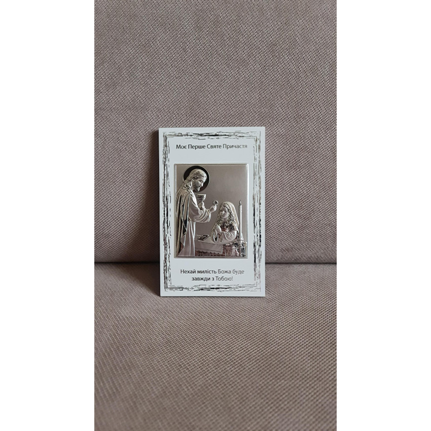 Срібна ікона Моє Перше Святе Причастя 10х16 для дівчинки з Ісусом та написом-побажанням