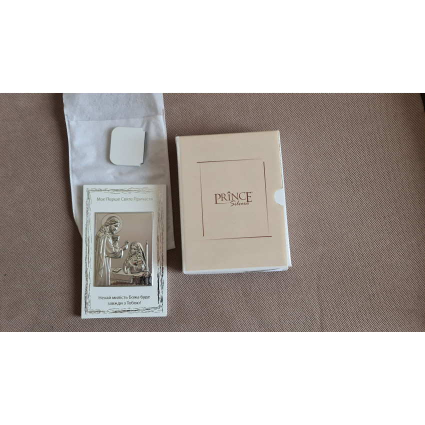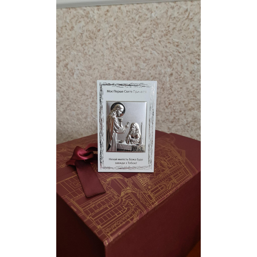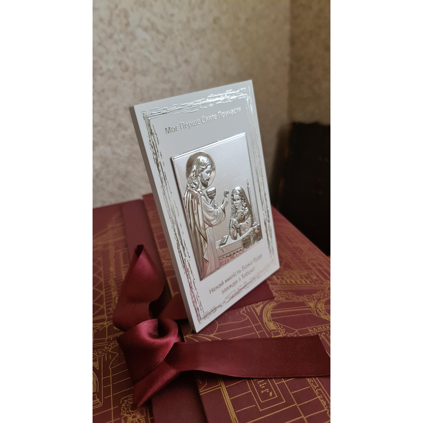 Срібна ікона для дівчинки «Моє Перше Святе Причастя» виконана у вигляді прямокутної рамки на світлій основі з рельєфним металевим медальйоном зі срібною ламінацією 999 проби, розмір 10×16 см. Елегантний дизайн виробу поєднує простоту форми з багатством духовного змісту. Виріб виглядає стримано й урочисто.