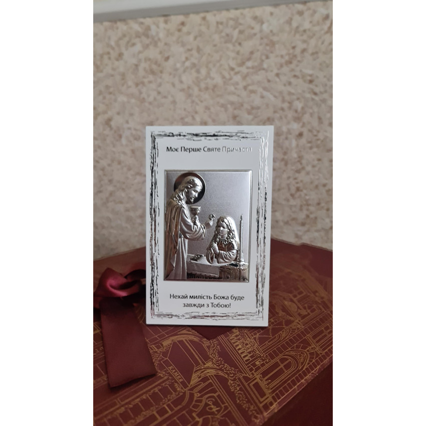 Центральна рельєфна сцена зображує Ісуса Христа, який тримає чашу і подає причастя дівчинці, що молиться з покладеними на груди руками. Поруч — книга та свічка, символи Слова Боже і благодаті. Написи «Моє Перше Святе Причастя» та «Нехай милість Божа буде завжди з Тобою!» роблять ікону особистою і зворушливою. Ікони на перше причастя із таким благословенням завжди є найбільш цінованим подарунком.