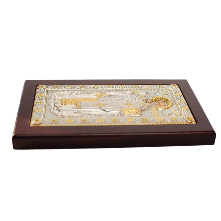 Оклад образу виготовлений із листа Miro-Silvero (італійського виробництва); нижня основа матеріалу - алюмінієвий віддзеркалюваний метал ALADO який зверху ламінований сріблом 999 проби тонким шаром. Срібло покрите захисним оксидним лаком, який зберігає матеріал від потемніння та зовнішніх подразників. Окремі частини ікони прикрашені сусальним золотом. Всі елементи сюжету ікони до найменших деталей та узорів чітко вирізьблені на окладі, які разом створюють гармонійну яскраву картину.Закріплений оклад в дерев'яній основі (кіоті) аркової форми, яка виготовлена із МДФ покритого шпоном дерева. Ззаду ікони є відкидна ніжна та отвір для кріплення на стіні.Колір дерева: коричневий (горіхова текстура).Лик ікони прописаний на полотні натуральними фарбами "Темпера" за допомогою метода шовкографії.Образ упакований в оригінальну картонну коробочку від виробника з логотипом компанії, яка має чудовий подарунковий вигляд.Ззаду на іконі є закріплений Сертифікат якості, який засвідчує оригінальність виробу.Виробник: Prince Silver Греція. ..
