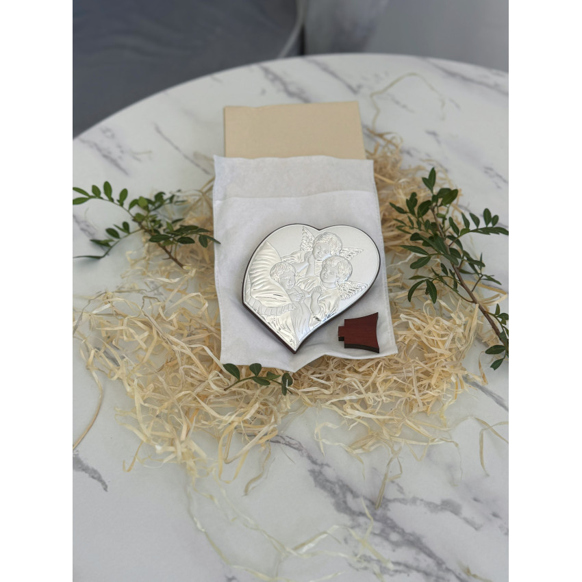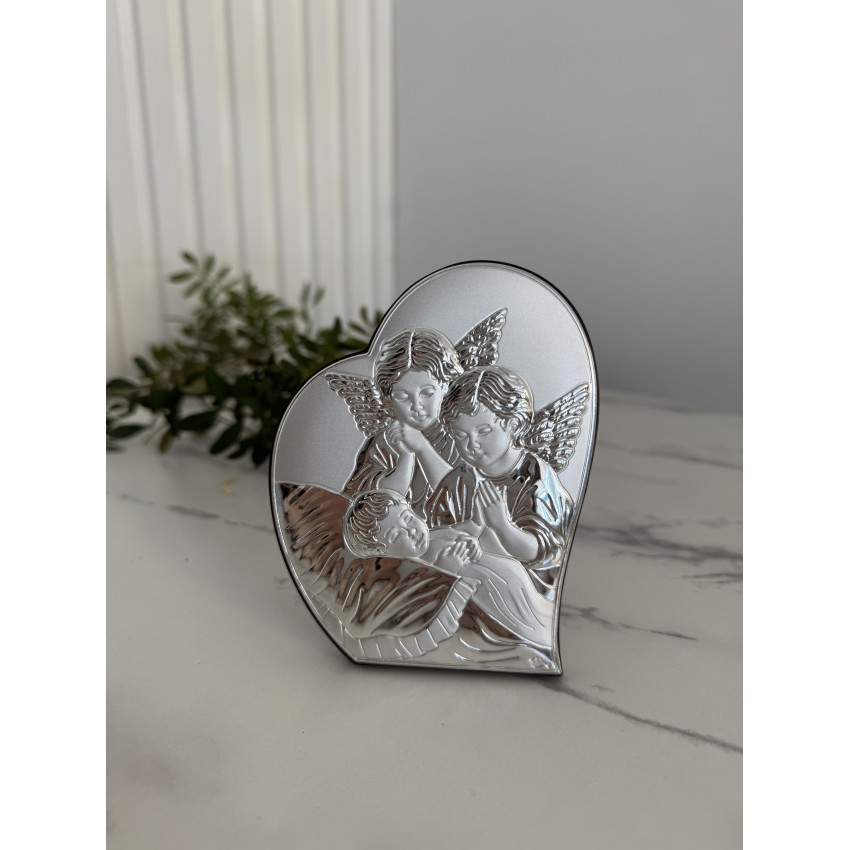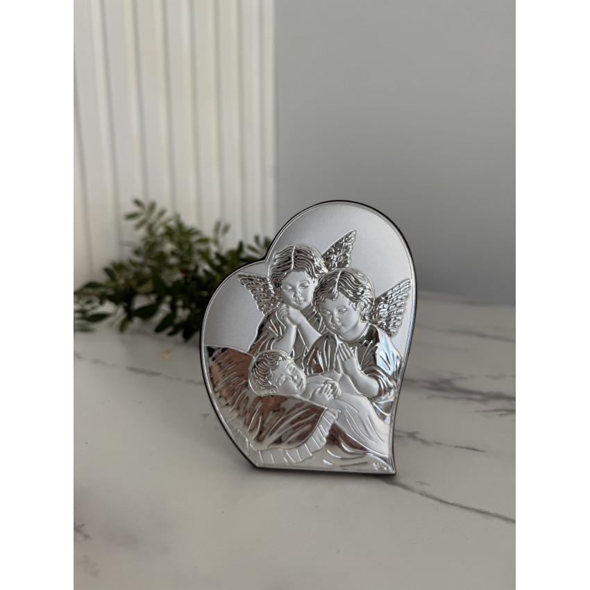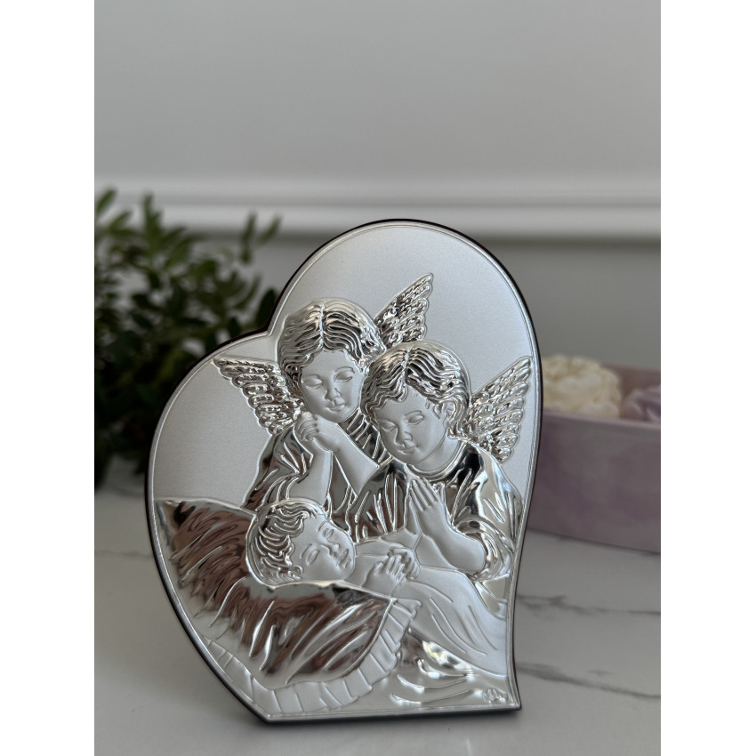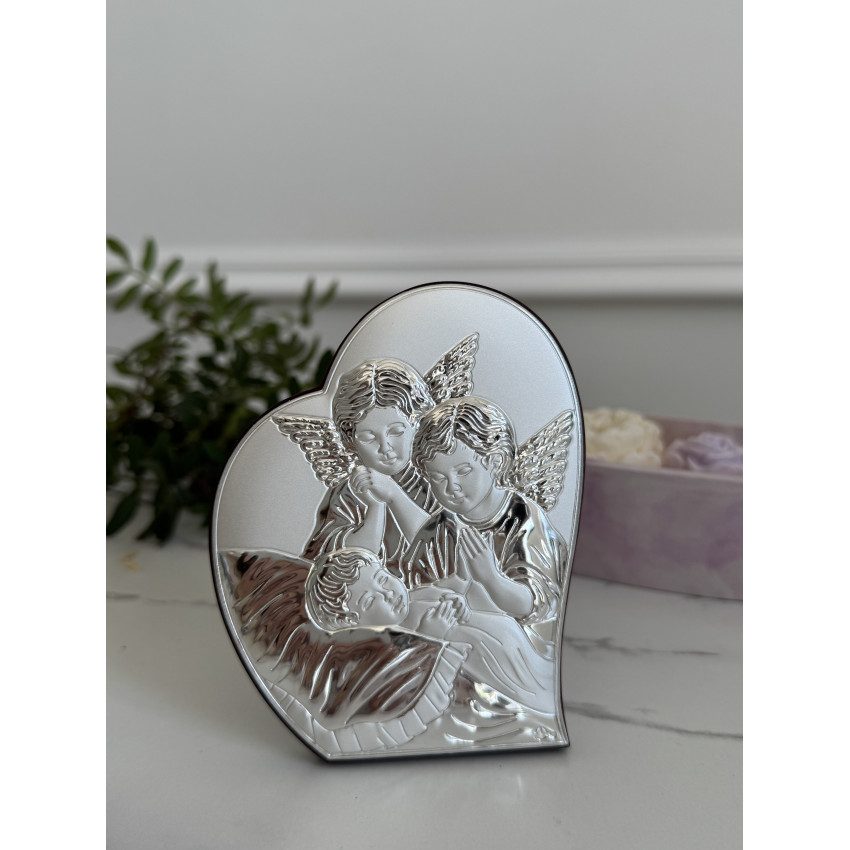 Срібна ікона у формі серця до Першої Сповіді та Урочистого Причастя 8.5х10.7 з Ангелами над немовлям