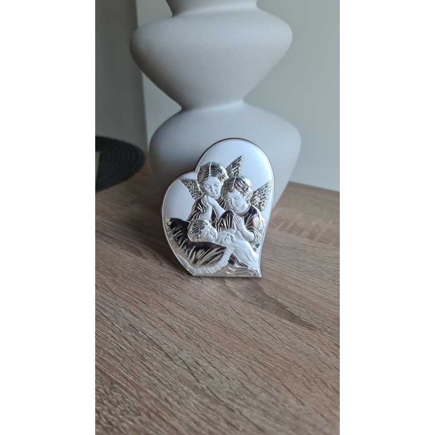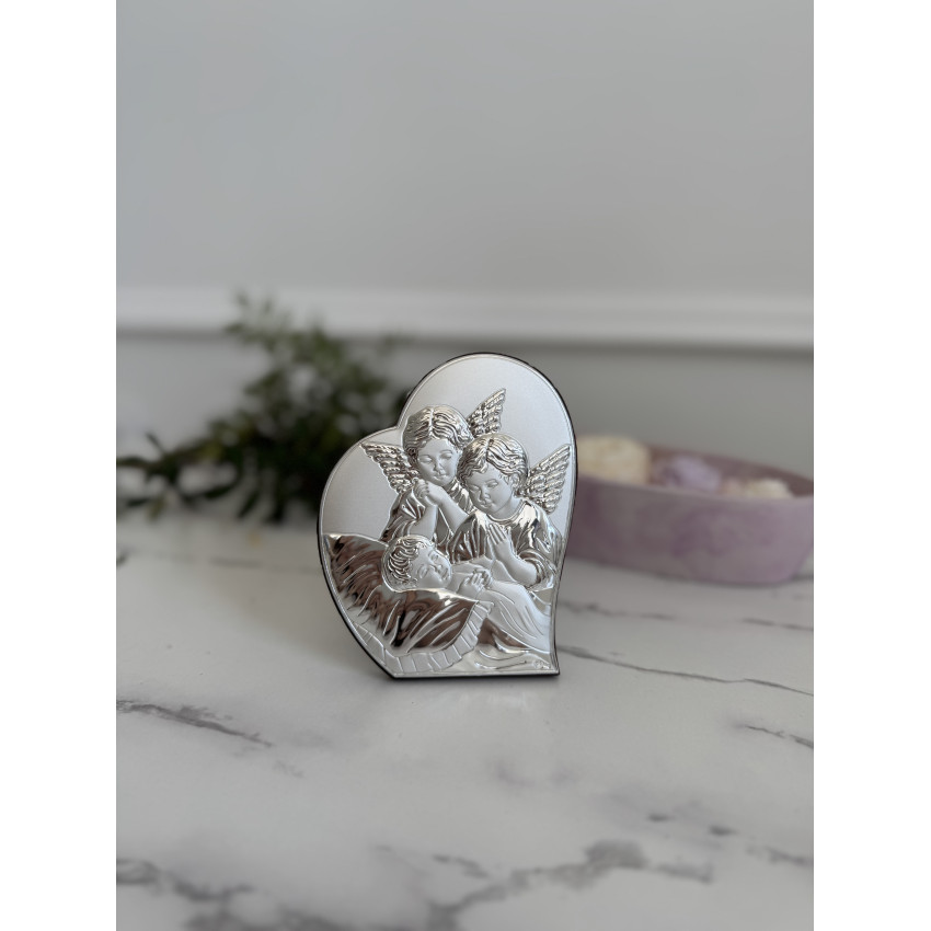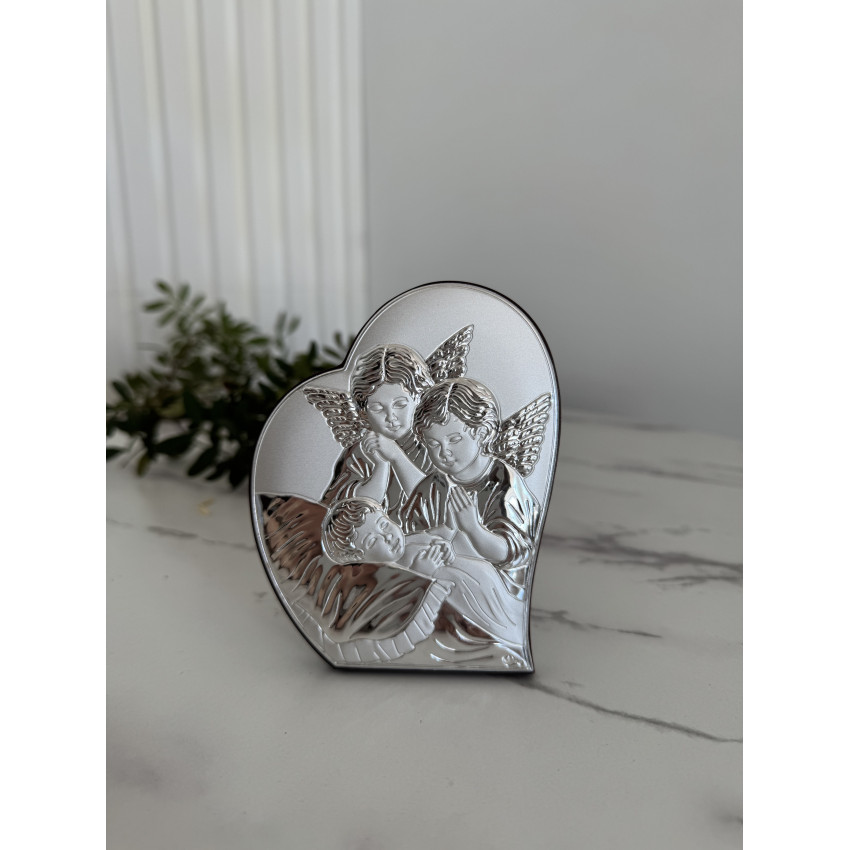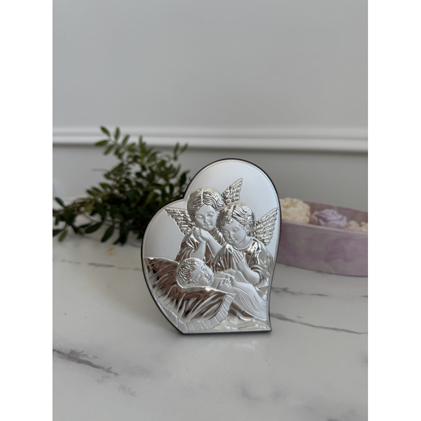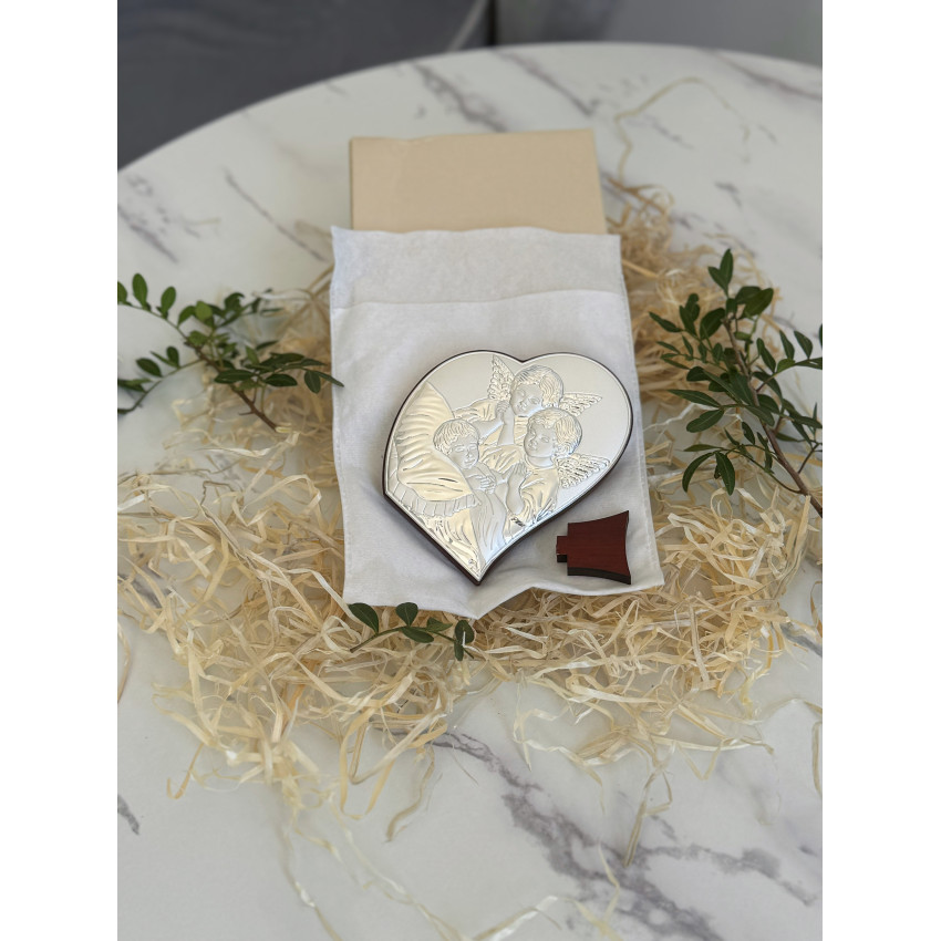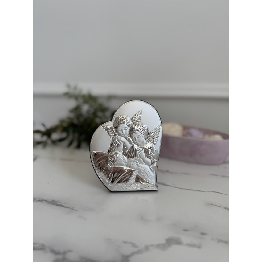 Срібна ікона у формі серця до Першої Сповіді та Урочистого Причастя 8.5х10.7 з Ангелами над немовлям