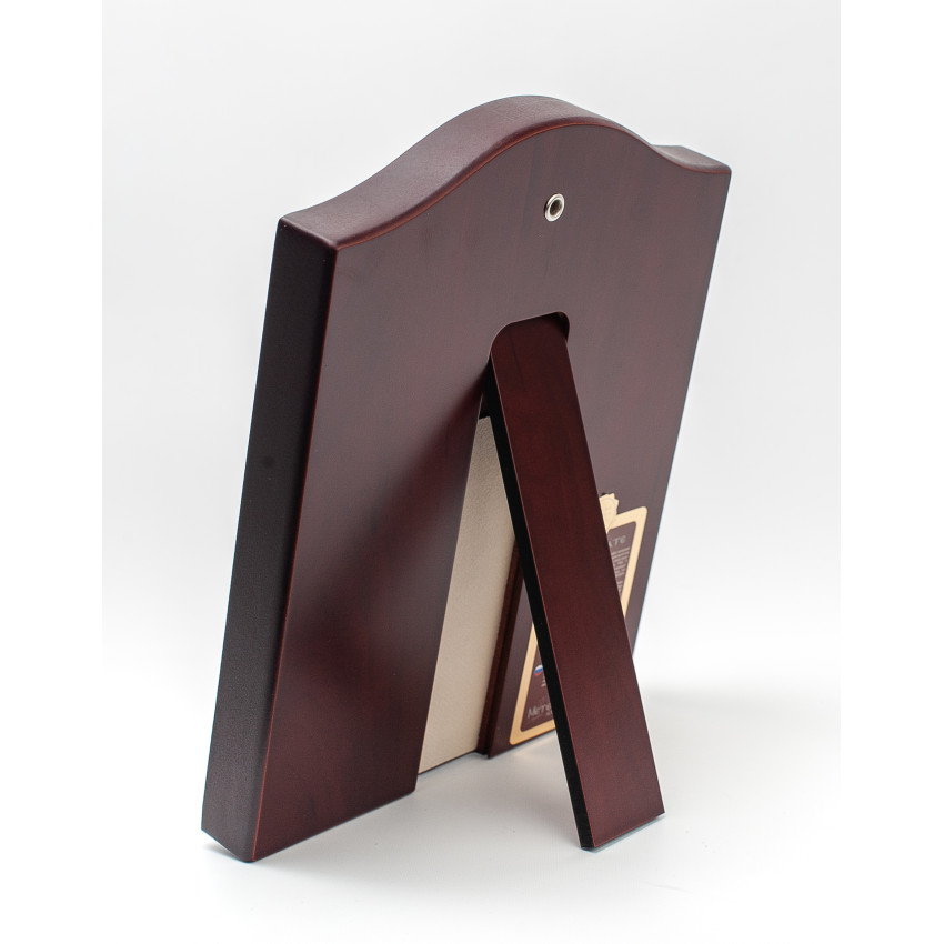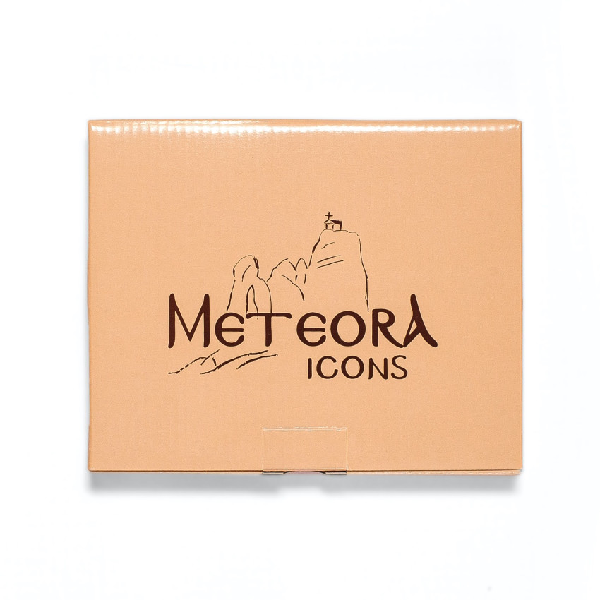Закріплений оклад на дерев'яному кіоті (основі) прямокутної форми, яка виготовлена із МДФ покритого шпоном дерева. Ззаду ікони є відкидна ніжна та отвір для кріплення на стіні.