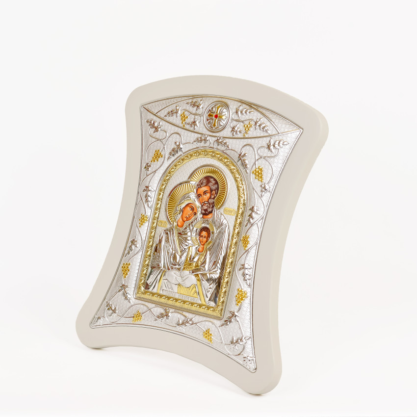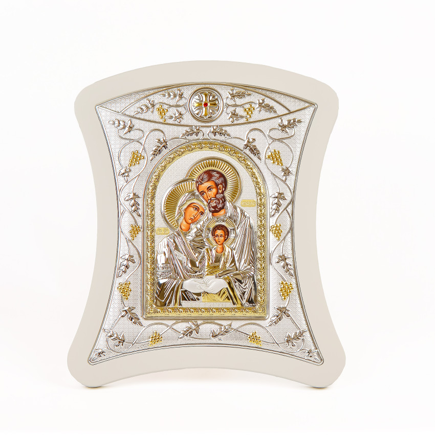 Иконы арочной формы "Святая Семья" в серебреном окладе 925° с позолотой который обрамлен в рамку из серебра и позолоты украшеной рисунками павлина, который держет виноград; лик прописанный натуральными красками "темпера" методом шелкографии. Оклад крепиться на деревянной основе, которая может быть в белом или коричневом цвете (МДФ покрытый шпоном ореха) Само деревянное основание сделано в выгнутой форме. Икона покрыта специальным лаком, для сохранения первозданного вида иконы.