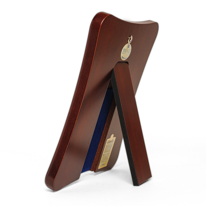 С обратной стороны икона имеет отверстие для того, что бы вешать на стену и откидную ножку, в самых малых размерах ножка вставная. На иконе имеется сертификат и фирменная печать производителя. Икона надежно упакована в оригинальную фирменную коробочку и мешочек.