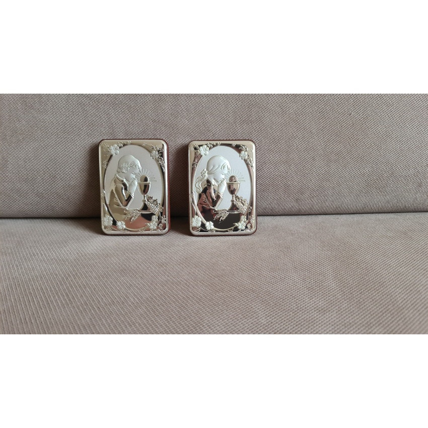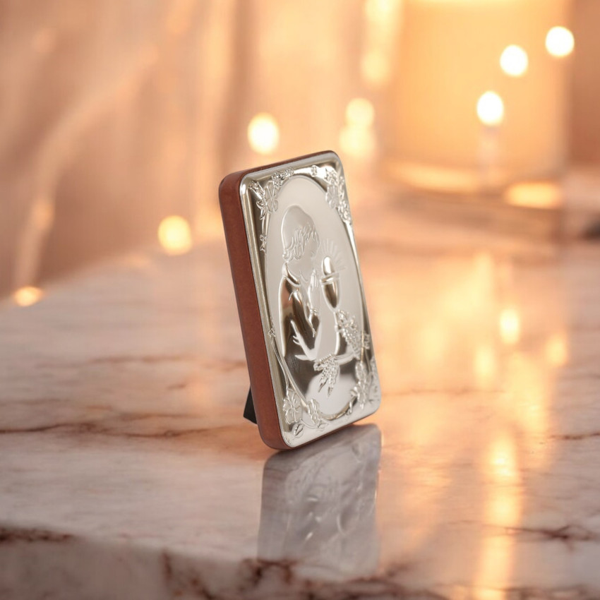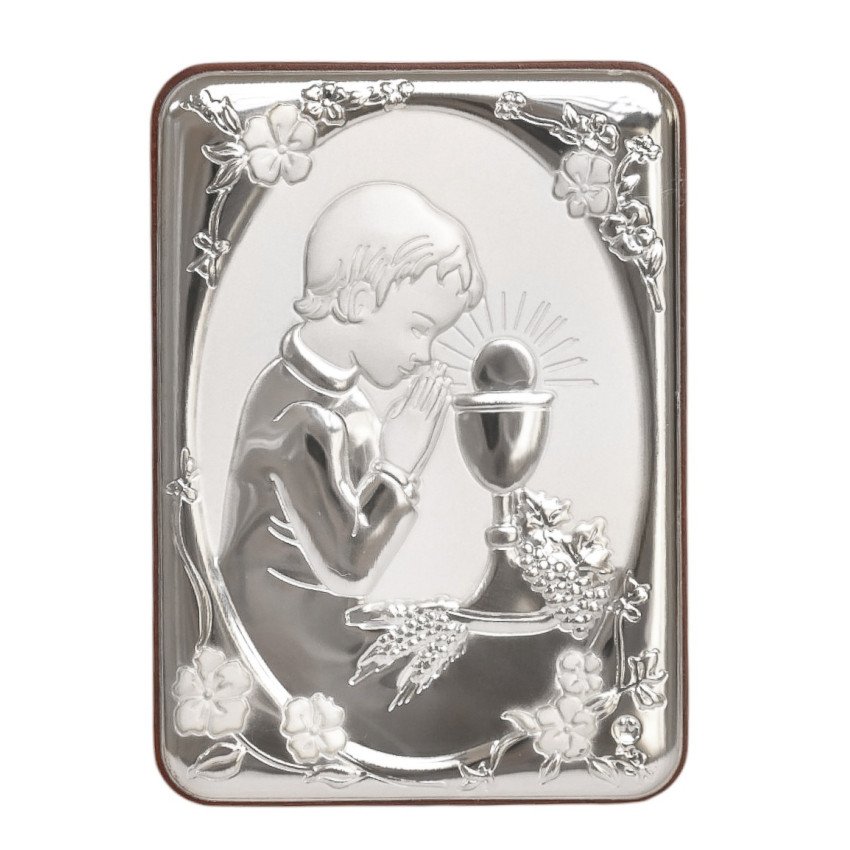 Прямокутна срібна іконка для хлопчика на Перше Причастя виготовлена з металу зі срібною ламінацією 999 проби розміром 7×10 см. Обрамлення прикрашене рельєфним квітковим орнаментом, що додає виробу святкової вишуканості. Матово-глянцеве покриття рівномірне та стійке до часу.