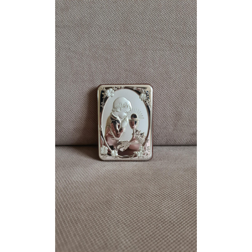У центрі композиції — хлопчик, що молитовно схилився перед чашею з причастям, над якою сяють промені Христового світла. Біля основи келиха зображені виноградні грона та колосся пшениці — вічні символи Євхаристії. Срібна ікона на перше причастя з таким сюжетом є глибоко символічною і духовно наповненою.