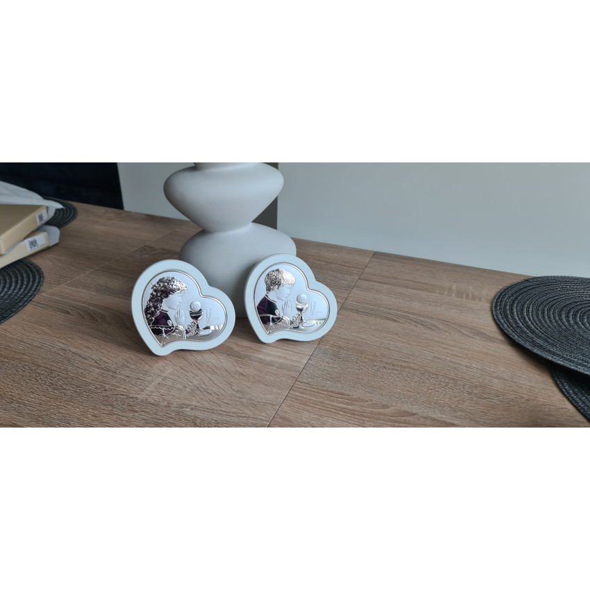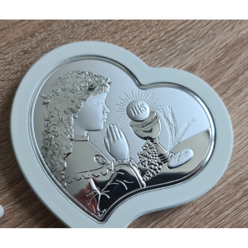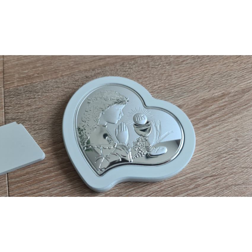 На рельєфній срібній поверхні зображена дівчинка у святковому вбранні, що молиться перед чашею з символом JHS та євхаристичним хлібом у сяйві Христового світла. Колосся пшениці та виноградна гілка доповнюють священну символіку таїнства. Ікона на перше причастя у формі серця — особливо тепла і щира за своїм змістом.