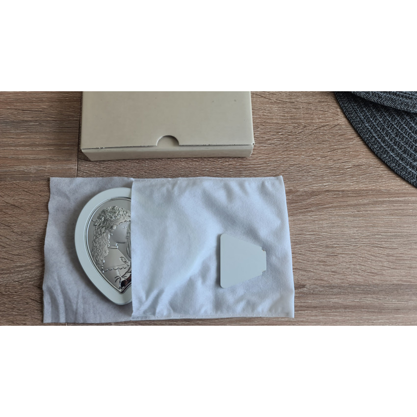 Срібна іконка у формі серця для дівчинки на Перше Причастя виготовлена з металу зі срібною ламінацією 999 проби, розмір 8,5×10,7 см. Форма серця надає виробу особливої ніжності й теплоти, органічно поєднуючи духовний зміст з естетичною красою. Матово-глянцеве покриття підкреслює вишуканість кожної деталі.