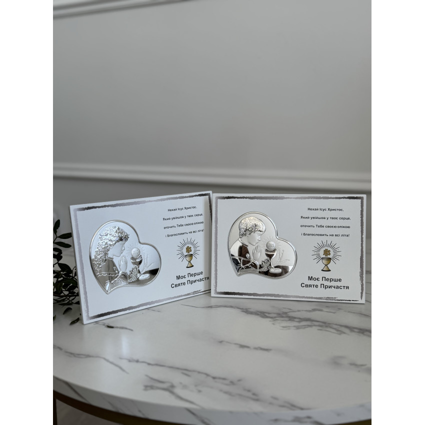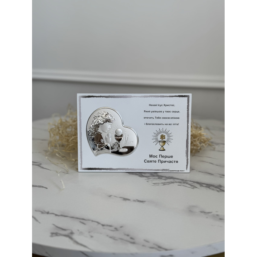 Вишукана срібна пам'ятка для дівчинки «Моє Перше Святе Причастя» виконана у прямокутному форматі на білій основі зі сріблястим обрамленням, розмір 20×16 см. Ліва частина прикрашена металевою рельєфною вставкою зі срібною ламінацією 999 проби — витонченою і деталізованою. Великий формат надає виробу значущості та виразності.