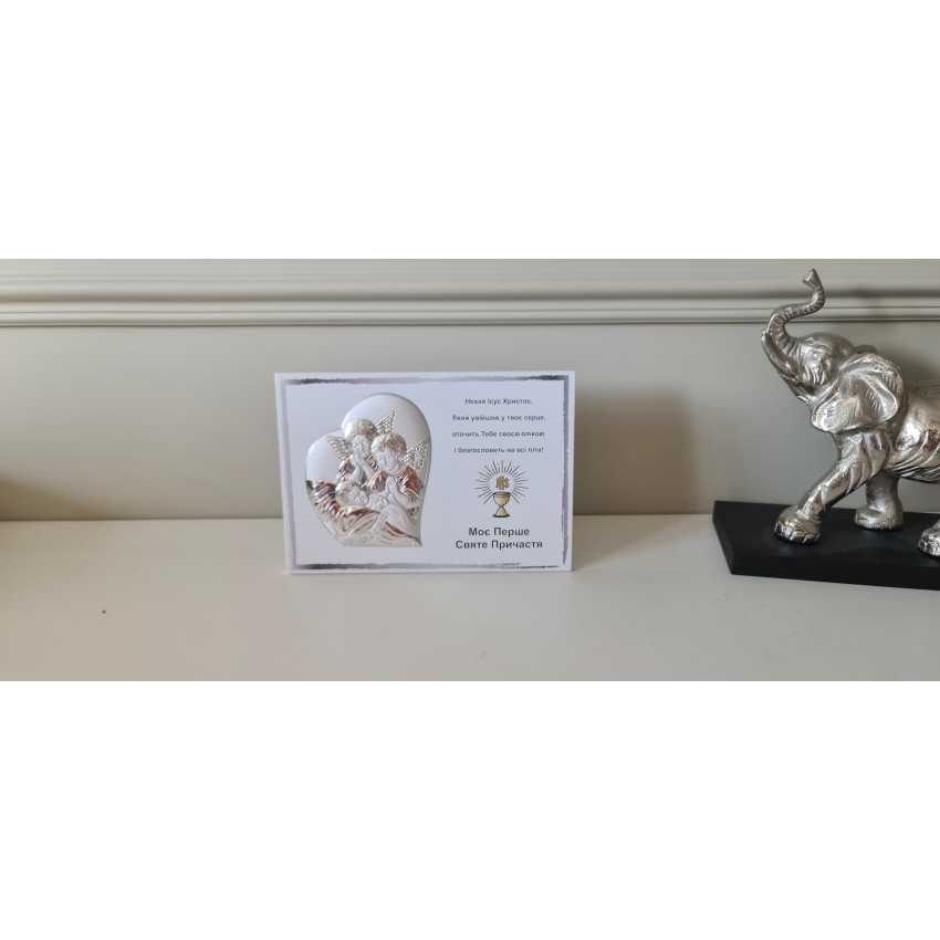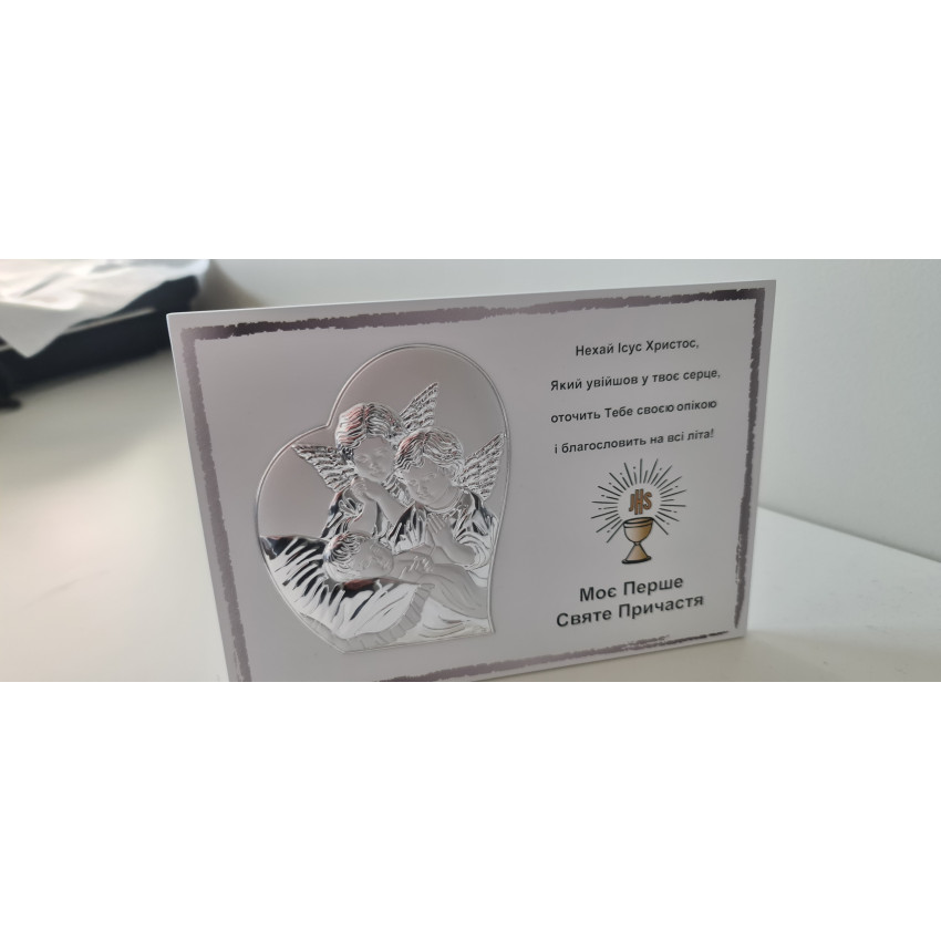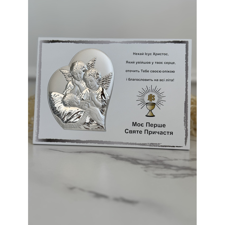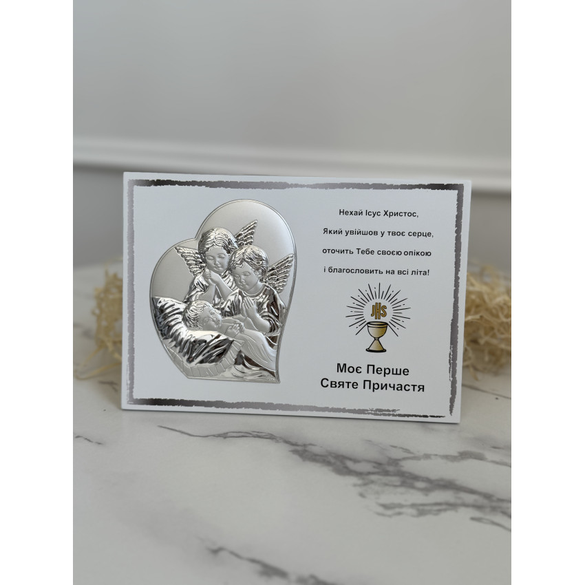 Унікальна срібна пам'ятка «Моє Перше Святе Причастя» виконана у прямокутному форматі на білій основі з глянцевою сріблястою вставкою у формі серця, розмір 20×16 см. Срібна ламінація 999 проби надає виробу шляхетного вигляду, а великий розмір робить його помітним і значимим. Це один з найвиразніших форматів пам'яток до першого причастя.