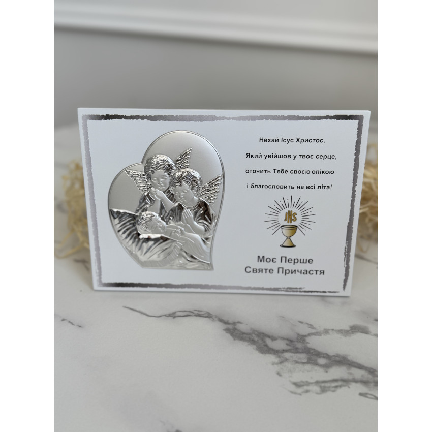 Срібна пам'ятка «Моє Перше Святе Причастя» — Ангел Охоронець у серці з молитвою
