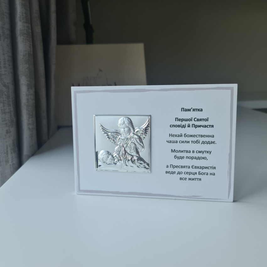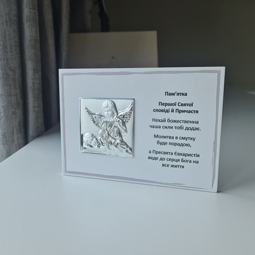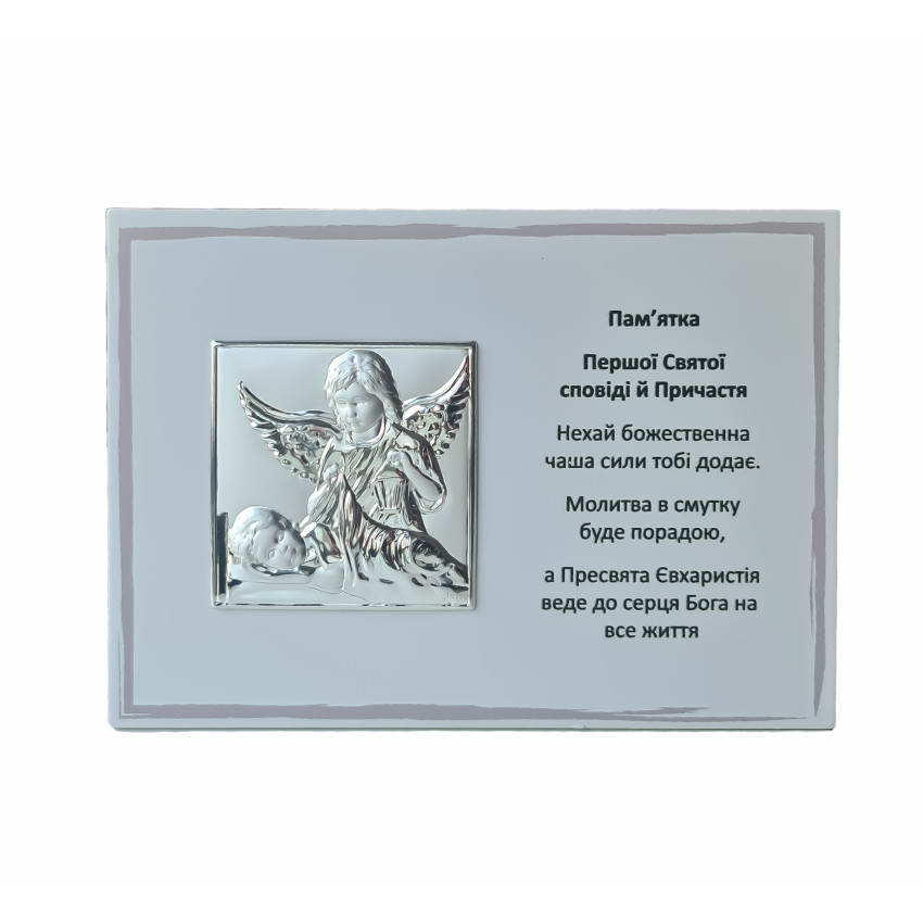 Срібна Пам'ятка на Перше Причастя з Ангелом Охоронцем 13х18см