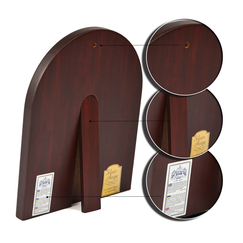 Для зручності розміщення образу – ззаду ікони є відкидна ніжка-підставка, а також отвір, щоб можна було повісити ікону на стіну.