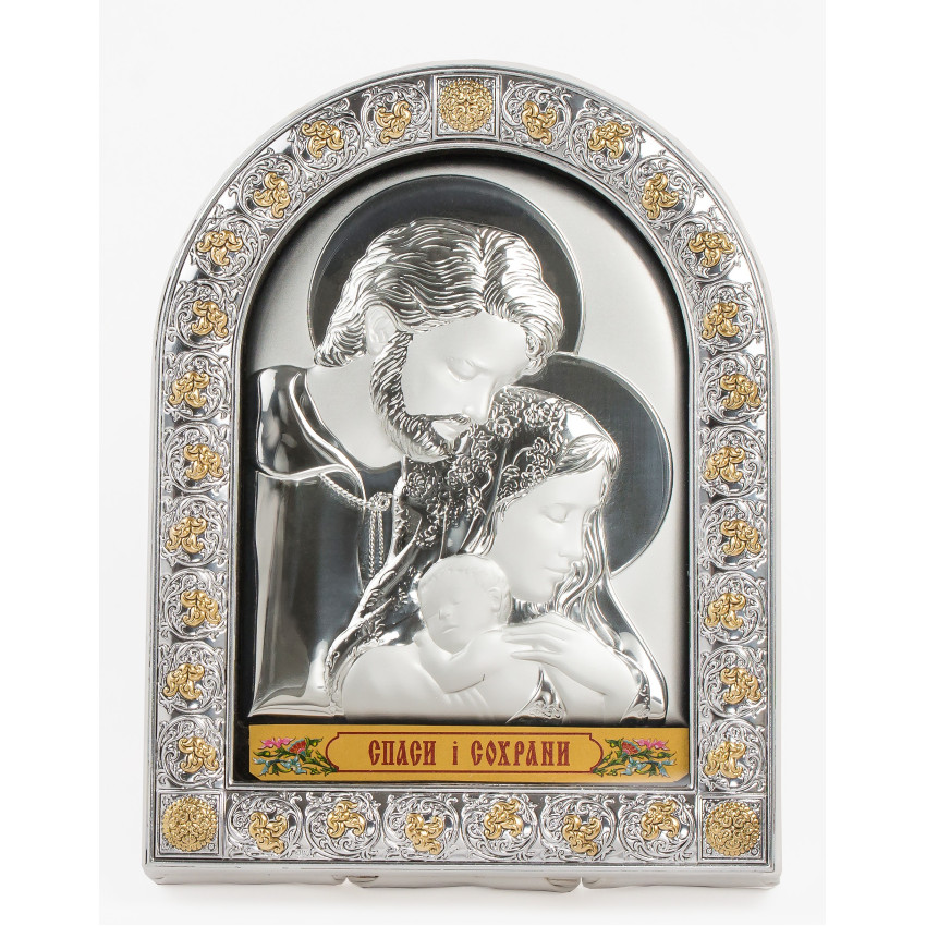 Образ Ікони Святе Сімейство виконаний в італійському стилі католицькому іконописі повністю в срібному окладі прикрашеному позолотою.